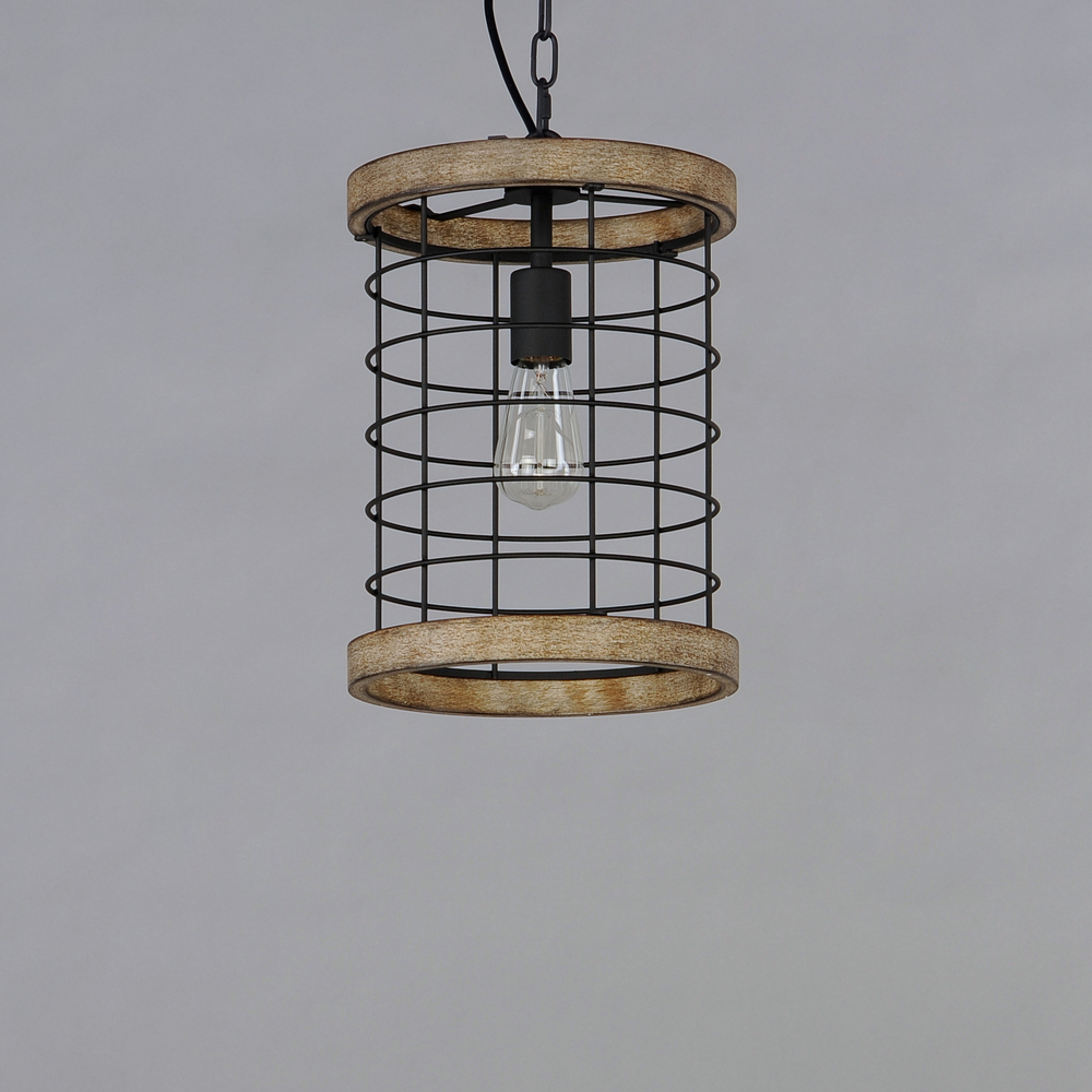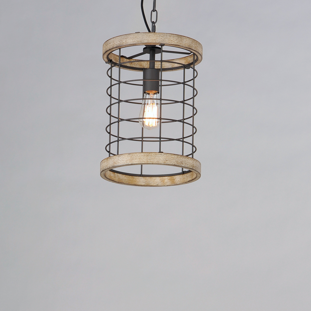 A modern blend of metal and wood is the perfect way to bring a little slice of rustic decor to any room. Exposed lamps are caged in a black metal framework and accented with distressed wood tones bringing this design out of the barn and into the 21st centu