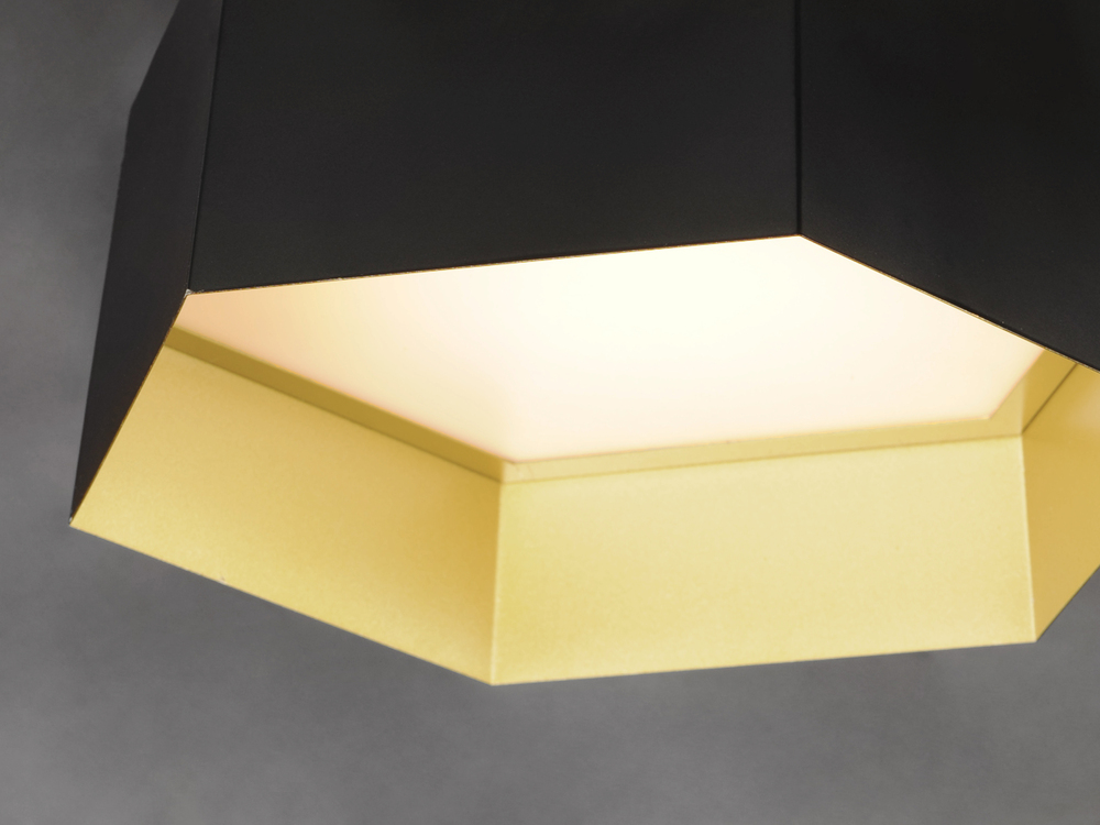 A series of hexagonal metal shades are slightly tapered to create a gentle arc when suspended together. The dramatic combination of Black with Gold interior adds flair to this unique and bold design. Ample illumination is provided by high power integrated