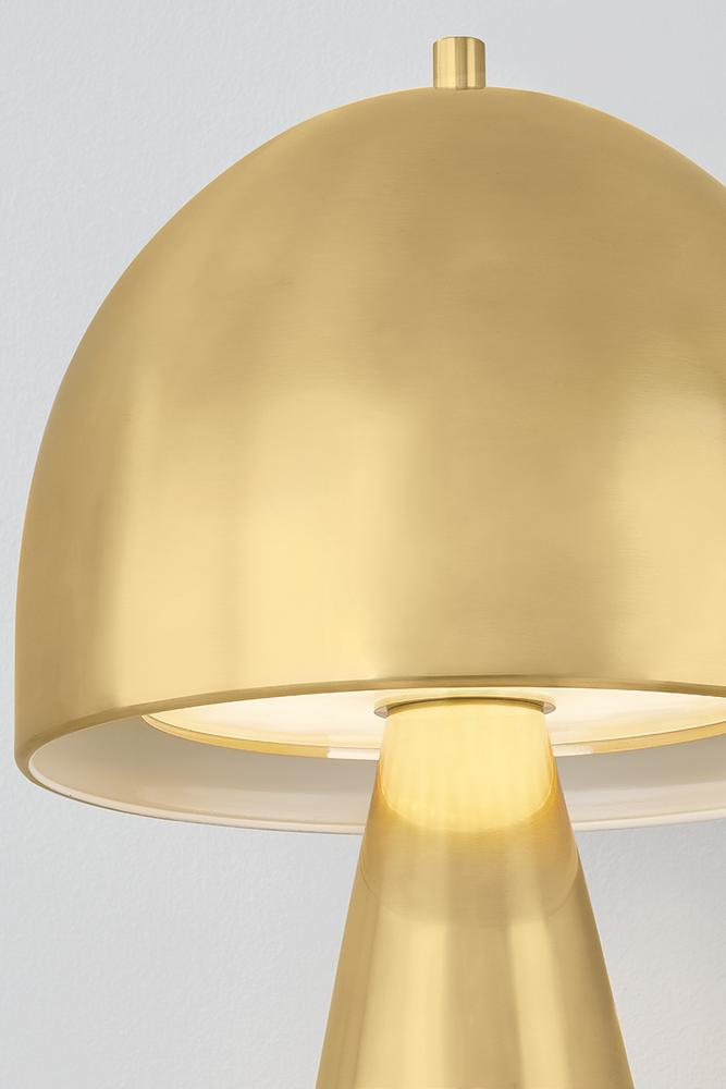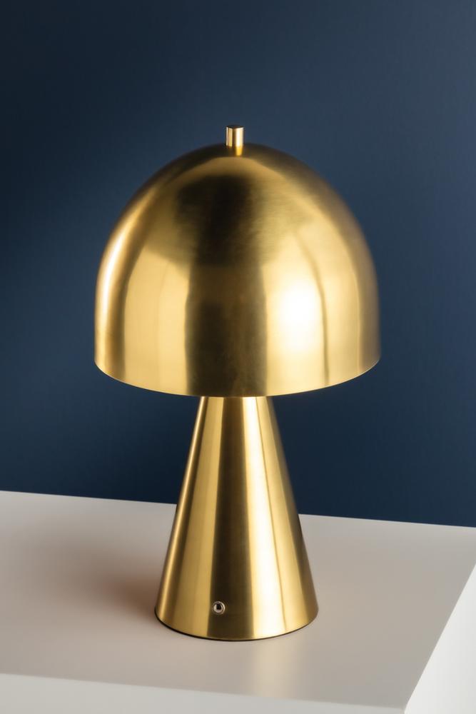 The contrast between the oblong domed shade and the conical base of Hopkinton creates a striking geometric design. Whether this petite lamp is finished in Aged Brass or Distressed Bronze, the on-trend mushroom silhouette adds a dose of personality. Its integrated rechargeable LED light source ensures lasting functionality.