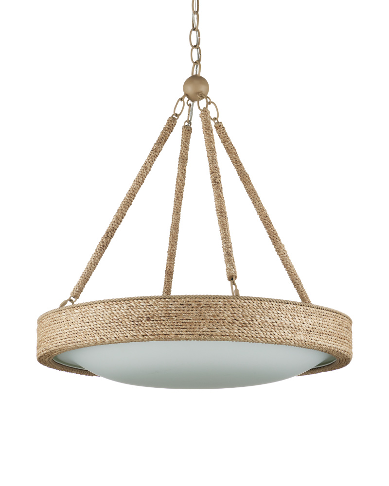 Proving the artistry of woven and wrapped natural materials, the Hopscotch Chandelier features a frame and arms seamlessly wrapped in abaca rope. A frosted glass diffuser is fitted to the bottom of the disc-like form, bowing downward in the middle to add an elegant touch. This rope chandelier is equipped with integrated LED technology. Adjustable from 32" to 100" with use of included chain/rod kit/cable. If your space calls for a longer drop, additional chain/rods/cable is available for purchase.
