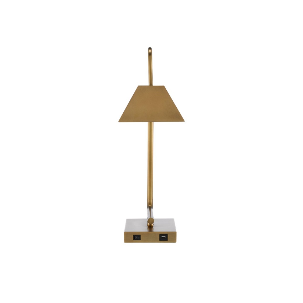 A perfect little desk lamp, our Hoxton Gold Table Lamp has a USB port in its base. Made of metal in a light antique brass finish, the gold lamp is an intermingling of geometric shapes that exhibit style. The rectangular shade completes the brass composition.