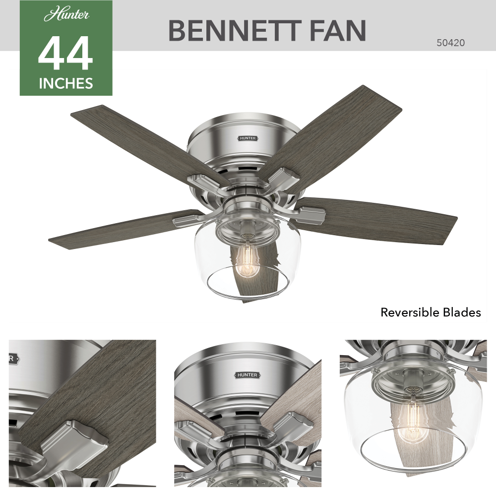 Hunter 44 inch Bennett Brushed Nickel Low Profile Ceiling Fan with LED Light Kit and Handheld Remote