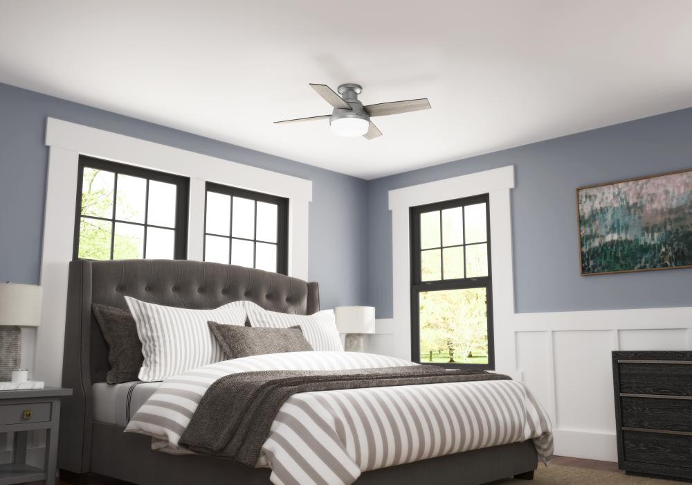 For homes with large rooms and average height ceilings, we offer the Dempsey low profile 44 inch fan. This fan will fit seamlessly in your home. Its angular blades and choice of beautiful finishes will create an inspired look in your space. The Dempsey’s fully dimmable LED light gives you control over the brightness in your space, and the 44 inch blades will keep your great room feeling good. Add other fans from the Dempsey collection for consistent modern style throughout.