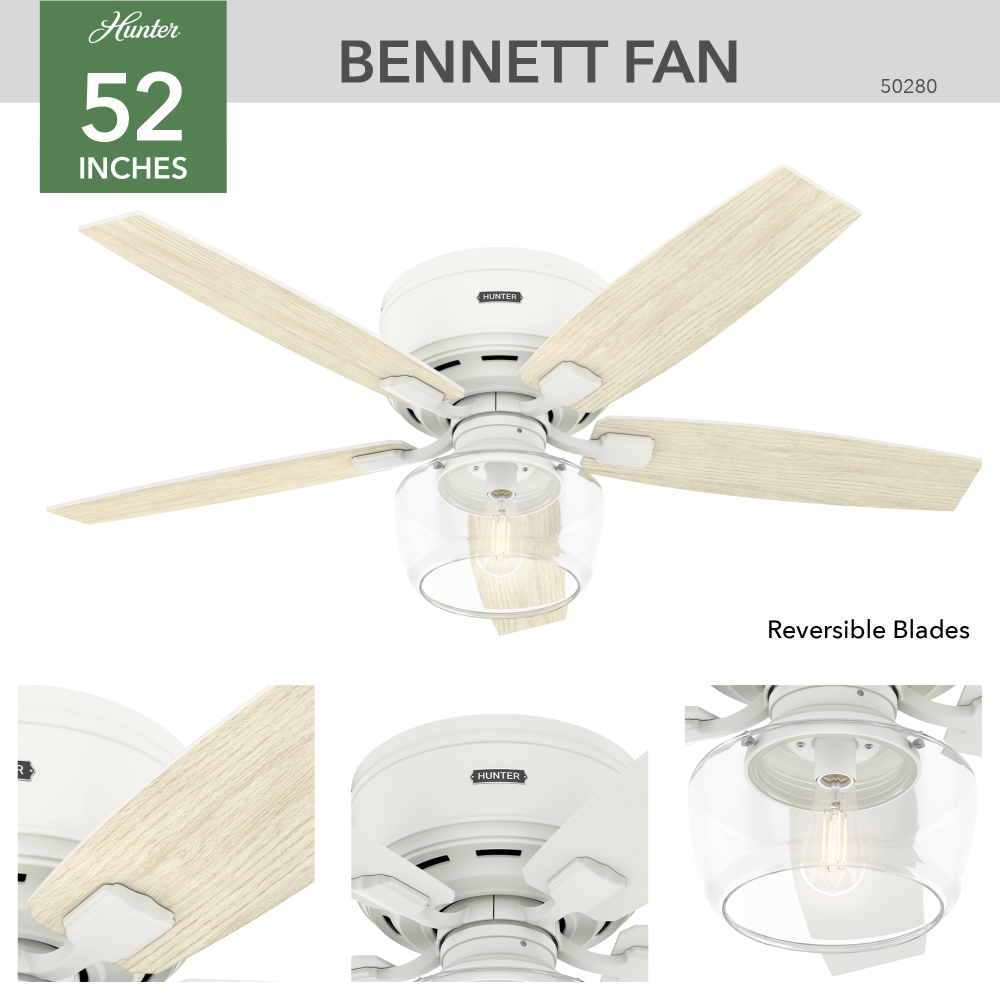 Hunter 50280 - Hunter 52 inch Bennett Matte White Low Profile Ceiling Fan with LED Light Kit and Handheld Remote