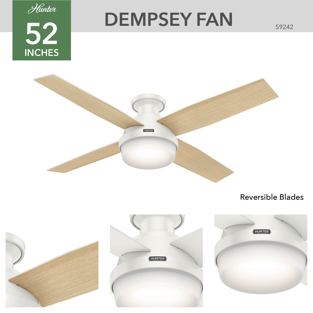 Hunter 59242 - Hunter 52 inch Dempsey Fresh White Low Profile Ceiling Fan with LED Light Kit and Handheld Remote