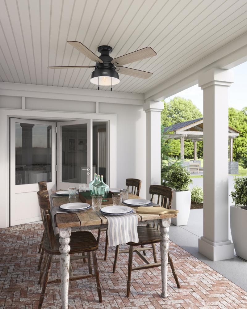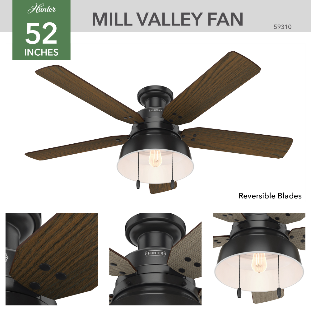 Hunter 52 inch Mill Valley Matte Black Damp Rated Ceiling Fan with LED Light Kit and Pull Chain