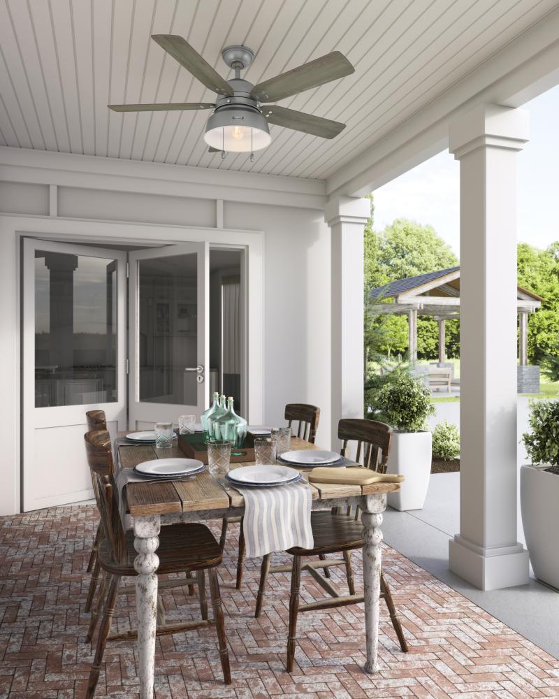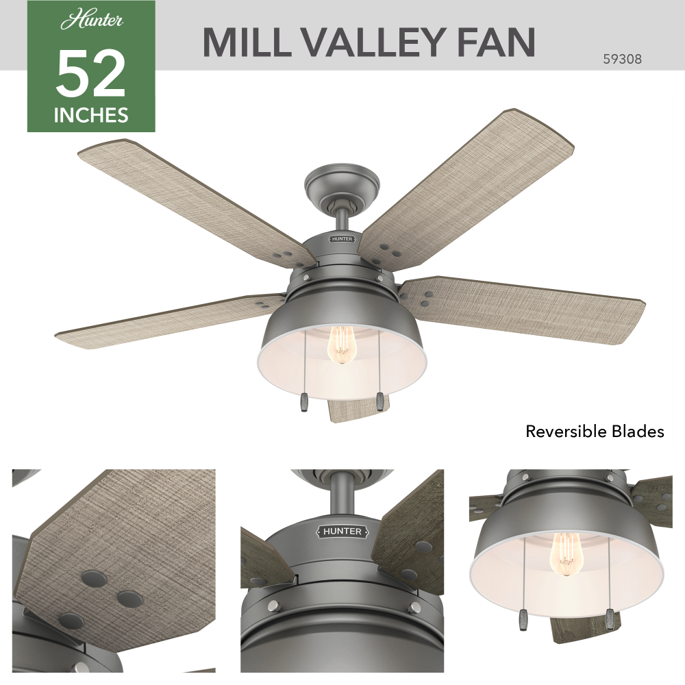 Hunter 52 inch Mill Valley Matte Silver Damp Rated Ceiling Fan with LED Light Kit and Pull Chain