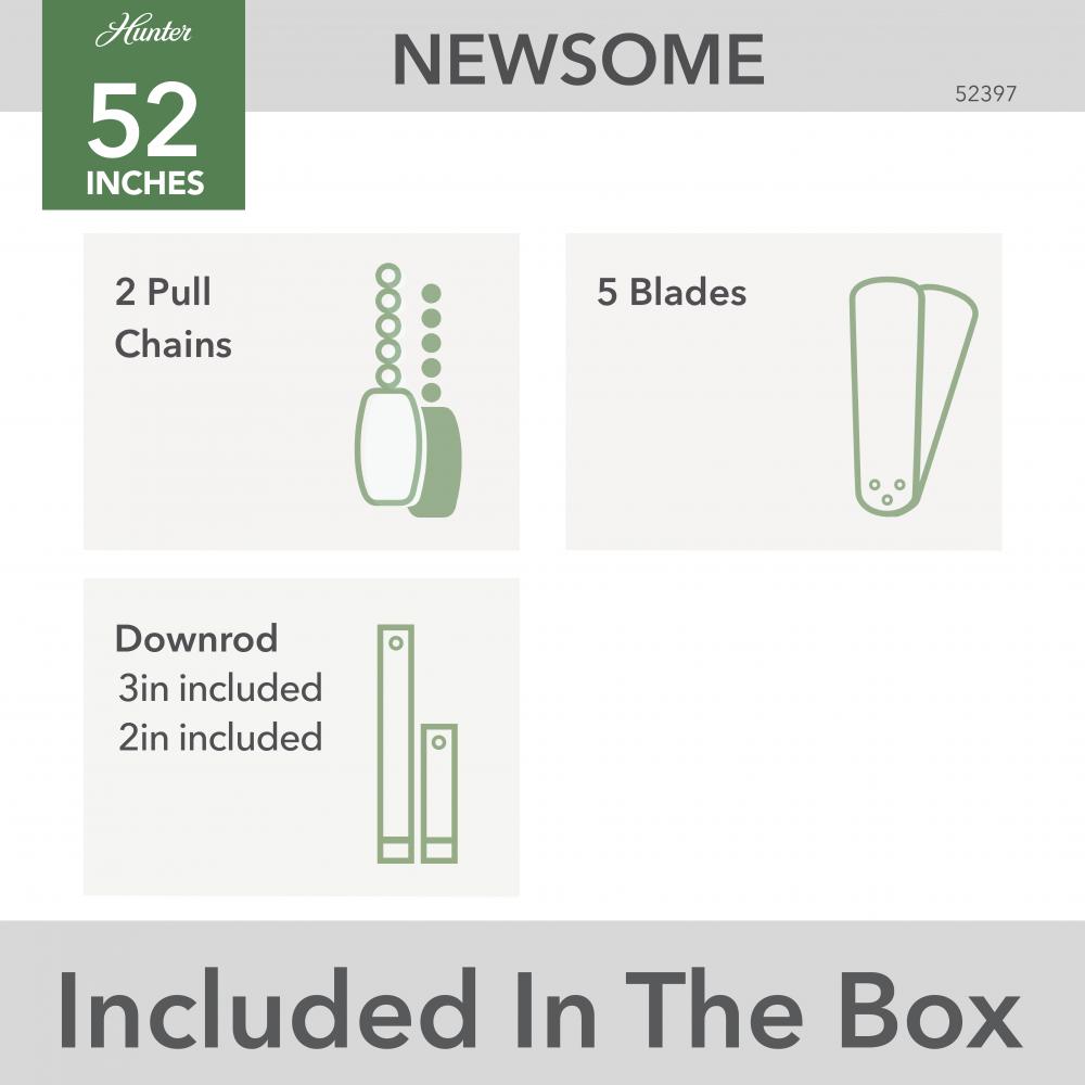 With its charming appearance, the Newsome traditional ceiling fan without light will complement your casual design style. The clean line details throughout the fan body and blade irons work together to create a coherent design that will fit any standard or large room space. The 52-inch blades are powered by a three-speed WhisperWind® motor delivering superior air movement and whisper-quiet performance so you get all the cooling power you want without the noise. The Newsome Collection offers you the freedom to choose from many different sizes, light kits, and other options to maintain a consistent look throughout every room in your home.