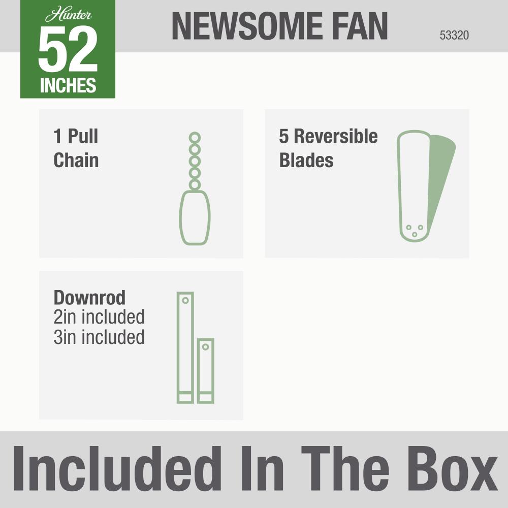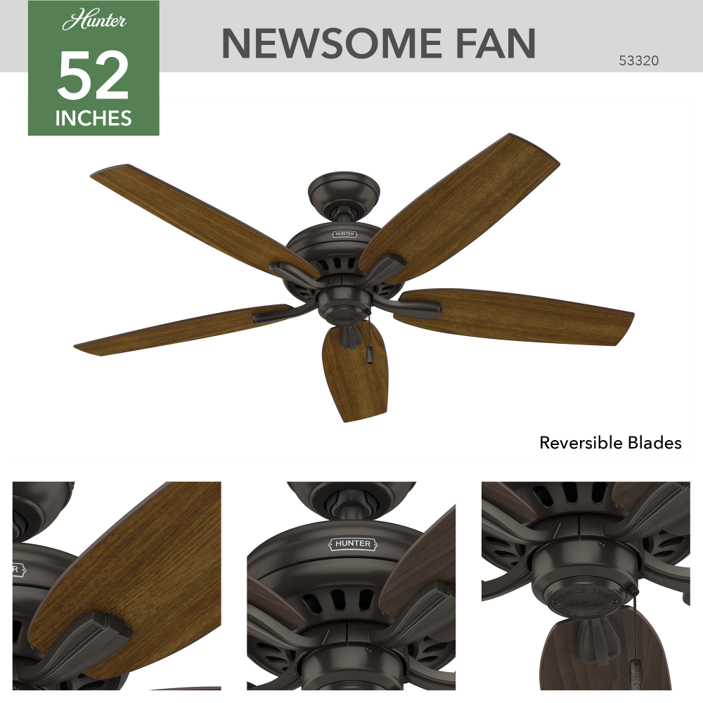 With its charming appearance, the Newsome traditional ceiling fan without light will complement your casual design style. The clean line details throughout the fan body and blade irons work together to create a coherent design that will fit any standard or large room space. The 52-inch blades are powered by a three-speed WhisperWind® motor delivering superior air movement and whisper-quiet performance so you get all the cooling power you want without the noise. The Newsome Collection offers you the freedom to choose from many different sizes, light kits, and other options to maintain a consistent look throughout every room in your home.