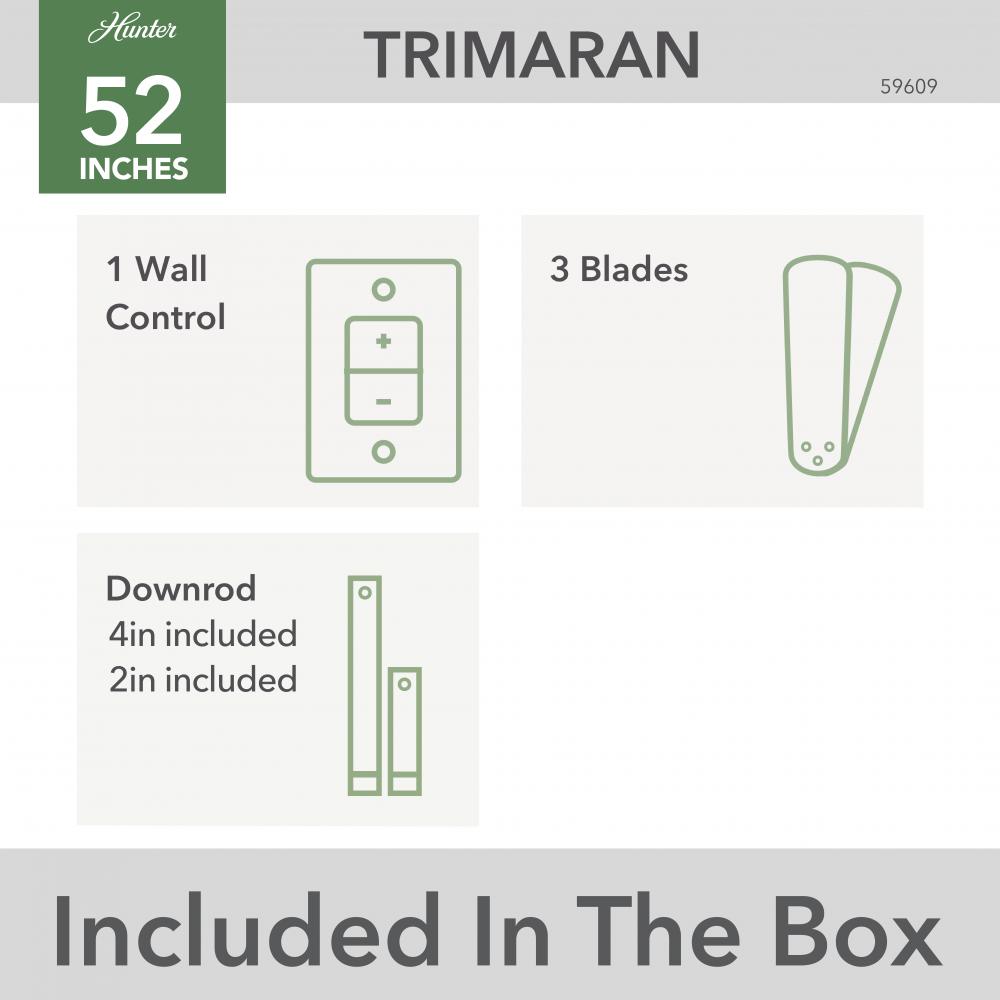 As a part of Hunter?s WeatherMax? Collection, the Trimaran outdoor ceiling is Engineered for the Elements?. It's wet rated as well as corrosion and salt-air resistant making it great for outdoor spaces like pergolas and patios. Easily control this ceiling fan without light with the included wall control. Available in classic finishes, this modern ceiling fan fits seamlessly in large, casual spaces.