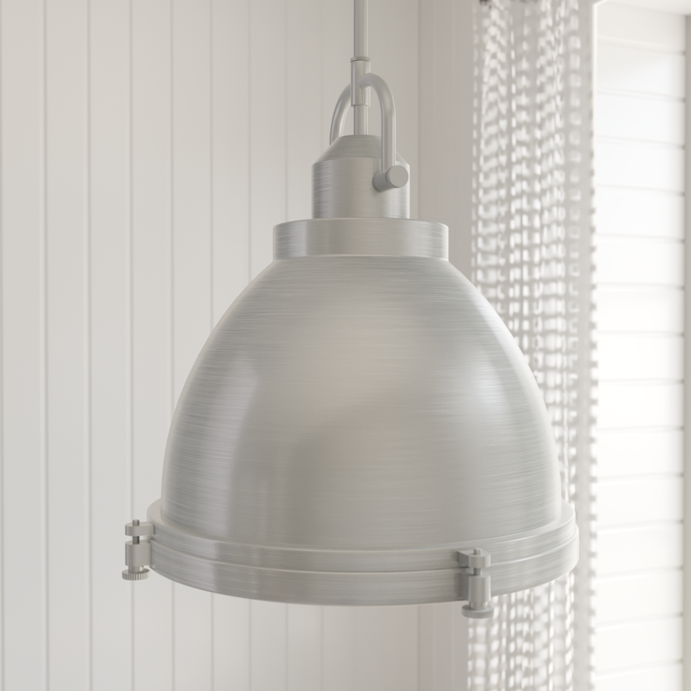 The Bridgemoor oversized pendant light makes an impact. The rustic hardware detailing gives this modern industrial pendant light an authentic and warm aesthetic, perfect for farmhouse style and other casual spaces. With a robust 17-inch diameter and 3 light sockets, this extra-large pendant’s style and light output are industrial sized.