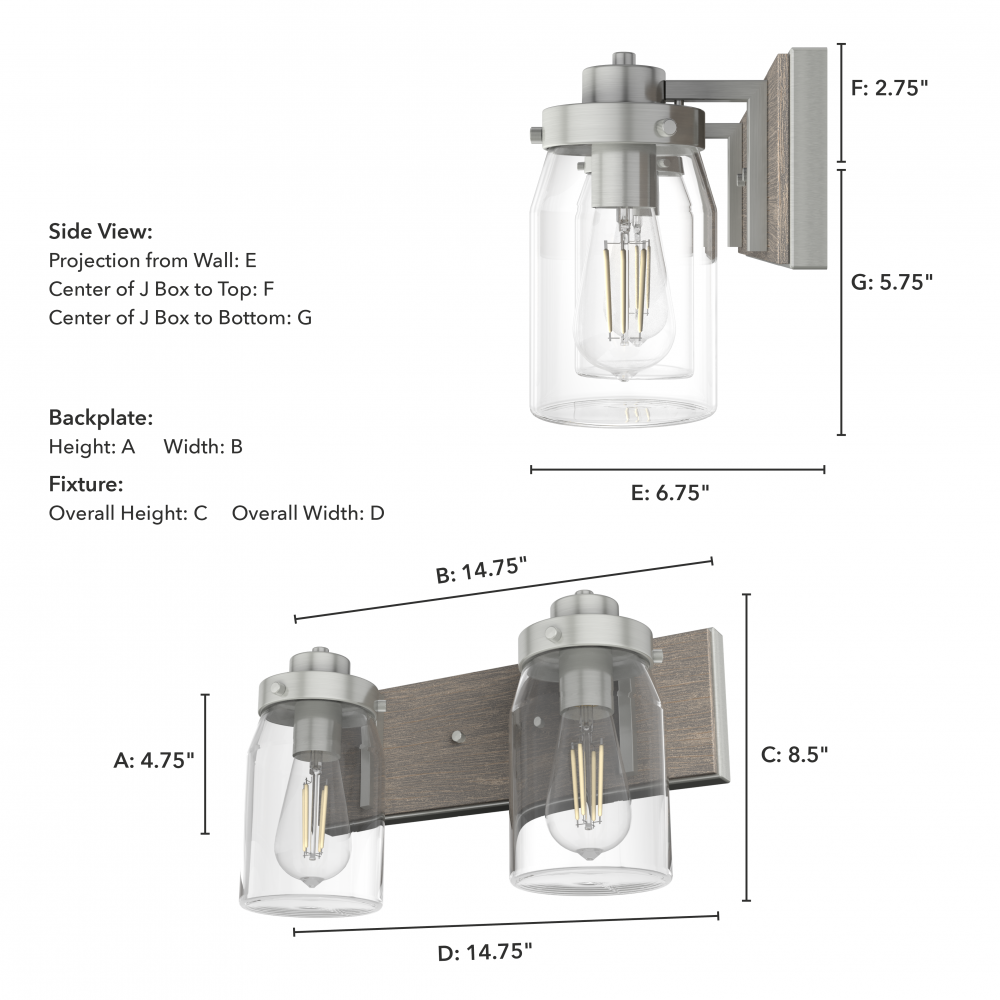 Hunter Devon Park Brushed Nickel and Grey Wood with Clear Glass 2 LT Bathroom Vanity Wall LT