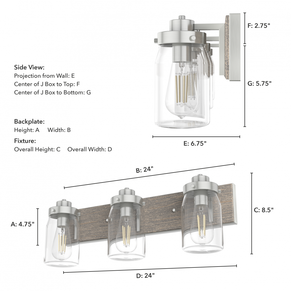 Hunter Devon Park Brushed Nickel and Grey Wood with Clear Glass 3 LT Bathroom Vanity Wall LT