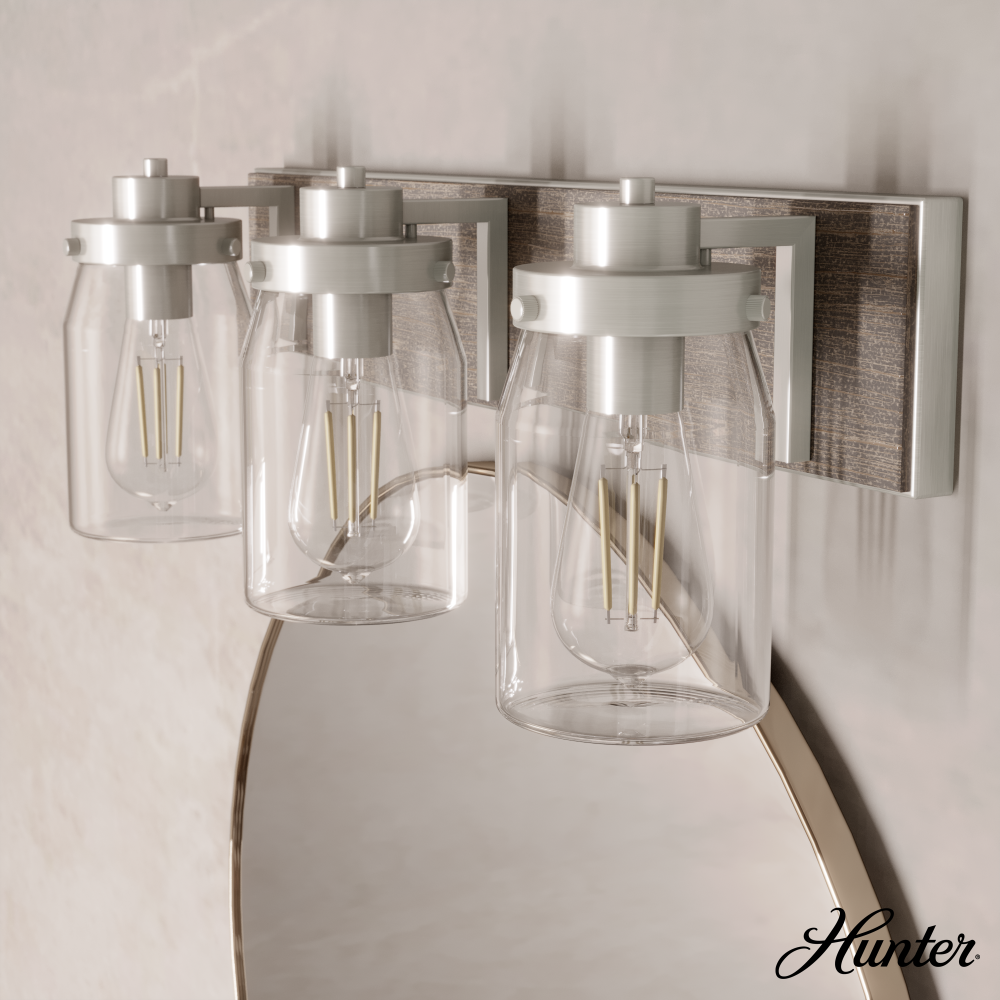 Hunter 48020 - Hunter Devon Park Brushed Nickel and Grey Wood with Clear Glass 3 LT Bathroom Vanity Wall LT