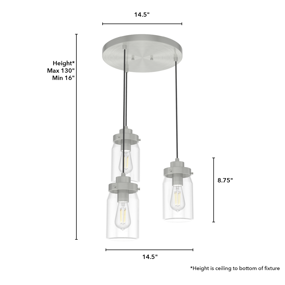 The Devon Park cluster pendant light is a charming centerpiece for your space. With a round base and three adjustable pendant lights, the Devon Park’s ball jar inspired glass shades cascade beautifully at varying heights. Add Edison LED bulbs to create a warm, inviting glow.