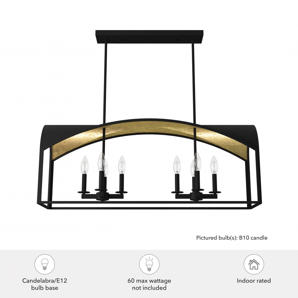 The Dukestown linear chandelier is a showstopping piece. Featuring metallic leaf detailing and striking arched silhouettes, this gorgeous piece masterfully balances traditional elegance with sophisticated style. Brighten up your kitchen or light up your dining room with this work of art from the Dukestown collection. Mix and match with other fixtures from this collection or from our ceiling fan designs.