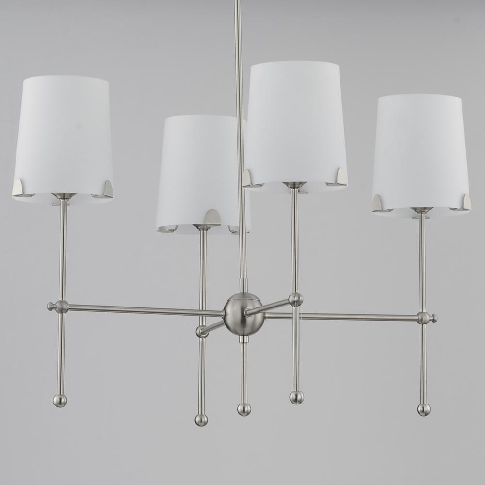 Satin White shades taper in a classic fabric shade shape and rest on elegantly thin frames of Satin Brass or Satin Nickel. They are supported secured by a mostly concealed structure with coordinating semicircular tabs that complement the spherical joints o