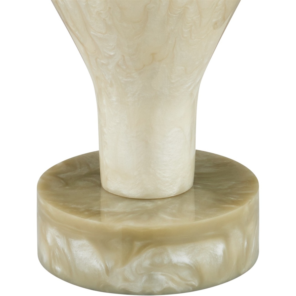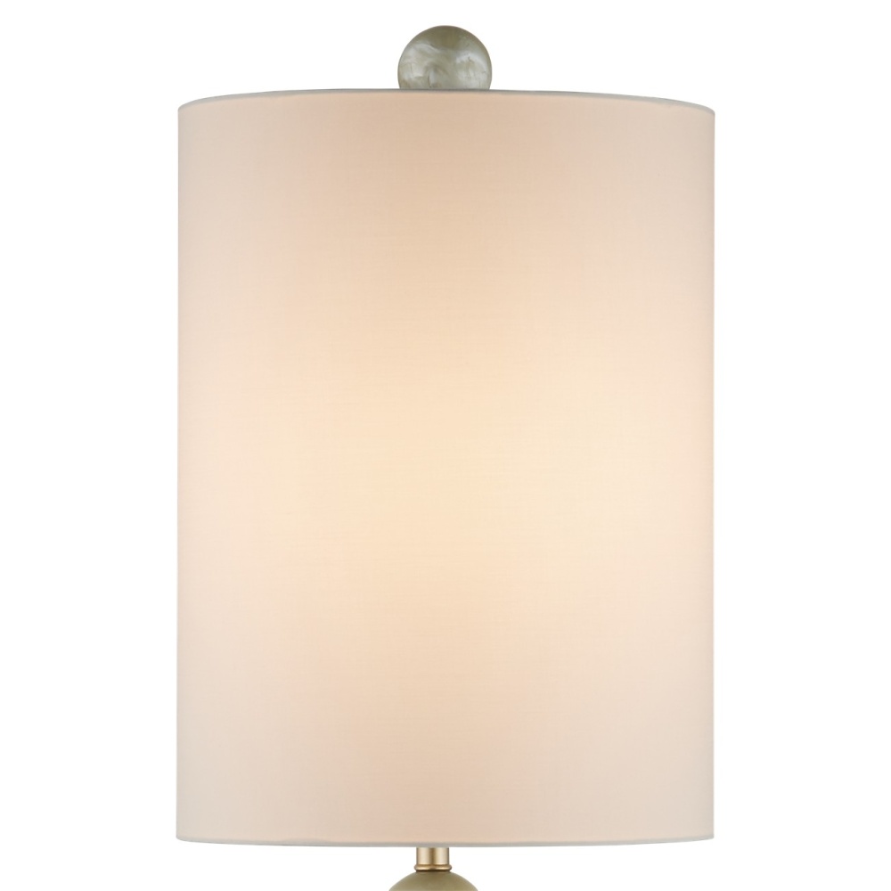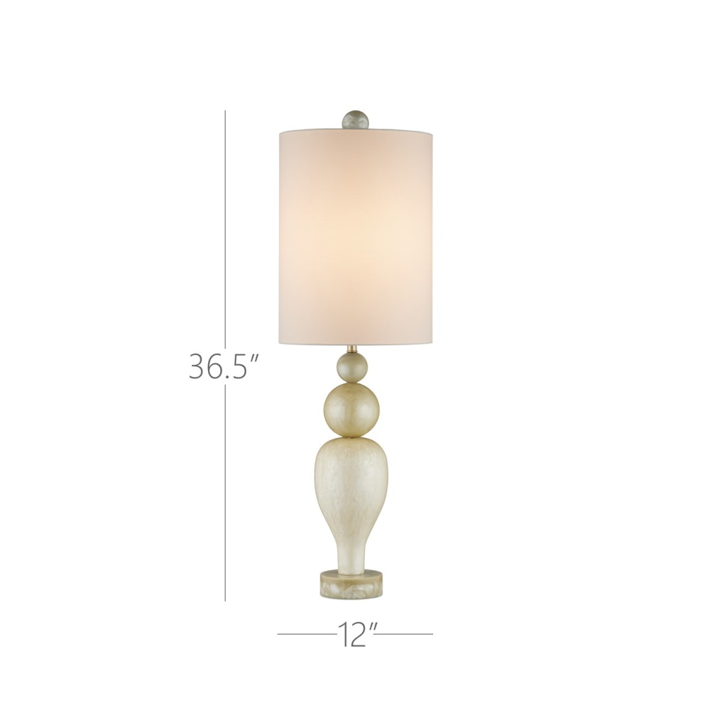 The Hutson Table Lamp is a Milano-inspired design made of composite finished with a pearlescent powders to bring added sheen to the surface of the three round shapes that graduate in color from lighter to darker as the geometric forms rise toward the shade. Sitting atop a disc-shaped base and topped with a very tall shade, the lamp is a great choice for console tables or buffets, as it is 37 inches tall but is only a foot in diameter.