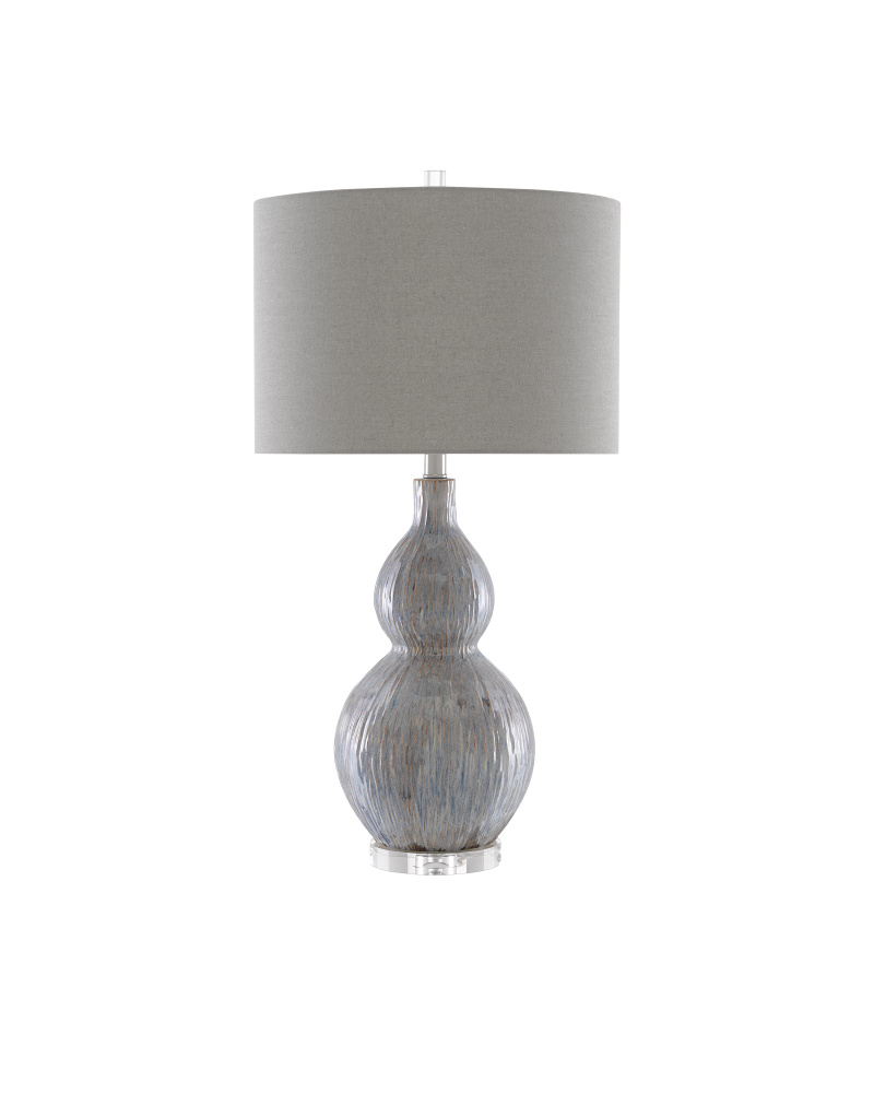 The gourd shape of our Idyll Table Lamp has been realized in porcelain. The striated surface in gray, blue, and taupe tones is texturally rich. The gray lamp sits atop a clear optic crystal base and is fitted with a gray shade.