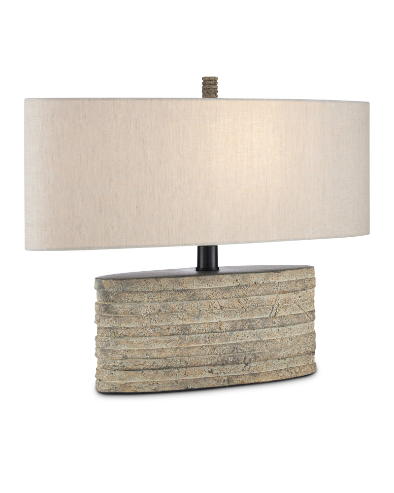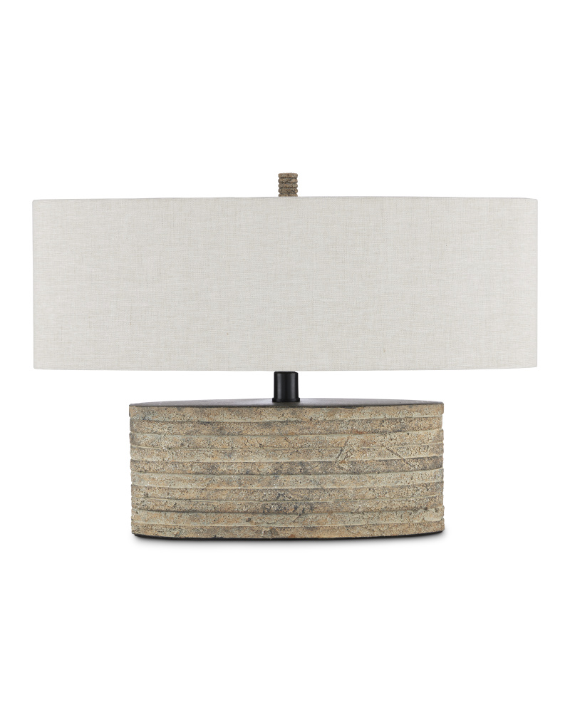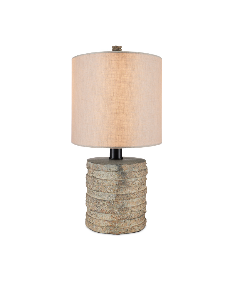 Flat discs of terracotta encircle a wrought iron spine on our Innkeeper Oval Table Lamp. The rustic feel of this natural material means it has subtle variations in color and texture that have been enhanced with a rustic granite finish. The gray table lamp is topped with a vanilla linen shade held in place by a matching terracotta finial. The scale of the elliptical shade is perfectly balanced with the smaller terracotta oval of its body.