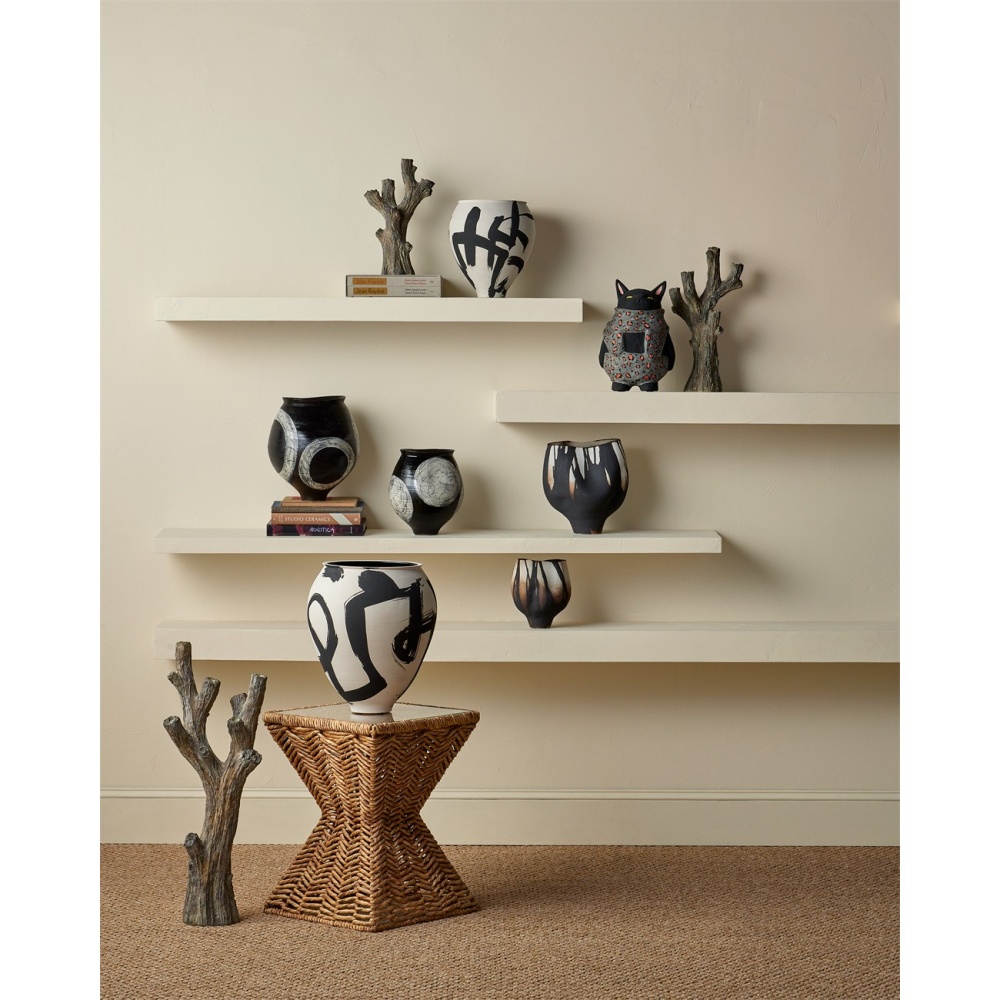 The dripped pattern on the surface of the Inoue Medium Vase was inspired by the art of Imperial Japan, particularly the rusticity of Zen ideals that arose during the Kamakura period. Made of porcelain, the black and off-white vessel is subtly rough to the touch and has a matte appearance. The gallery-worthy vase is hand-thrown and hand-decorated so the patterns will vary slightly.