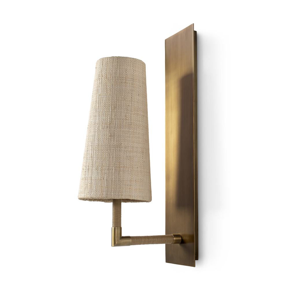 Sconce, made of brass, features tan leather hand-wrapped poles accented with antique brass details and hardware with natural raffia shade. Sconce is complete with an antique brass finished metal backplate. Professional installation is recommended. Coordin