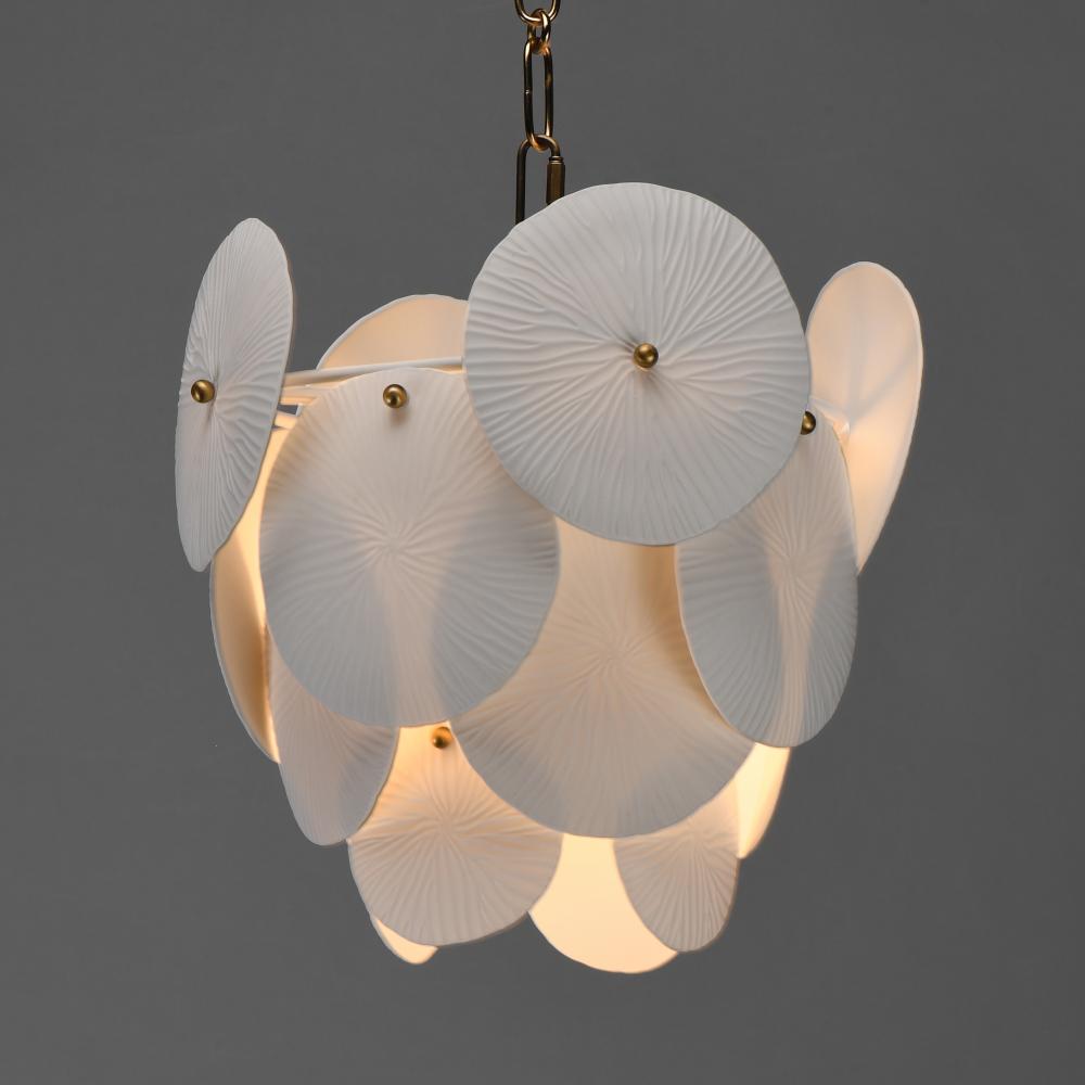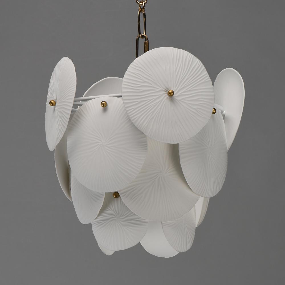 Featuring suspended tiers of textured, translucent ceramic panels, this design softly diffuses light across an undulating Matte White frame. Tiny brass knobs secure the veined ceramic panels, allowing the light to highlight their intricate texture and crea