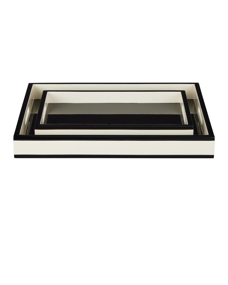 The luxuriousness of lacquer has been prized in interiors through the ages, and the Ivory Lacquer Tray Set -- a pair of nesting decorative trays -- is an example of the artisanship that has given the treatment such lasting appeal. Made of wood, the pair of larger-than-average trays feature vibrant navy surfaces rimmed in rich black, which also covers the interior bottom surface. These trays are not food safe and not heat- or cold-resistant.