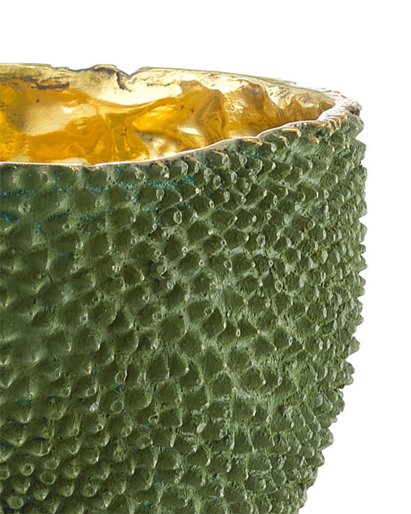 Our Jackfruit decorative vessels include the Jackfruit Medium Green Vase that is made from a lost-wax process so it reads as if it is covered in the skin of the jackfruit. The inside of each bronze vase is a brilliant gold made of polished solid bronze, which will need to be cleaned from time to time to maintain its sheen. These green decorative vessels are watertight so they will not leak.