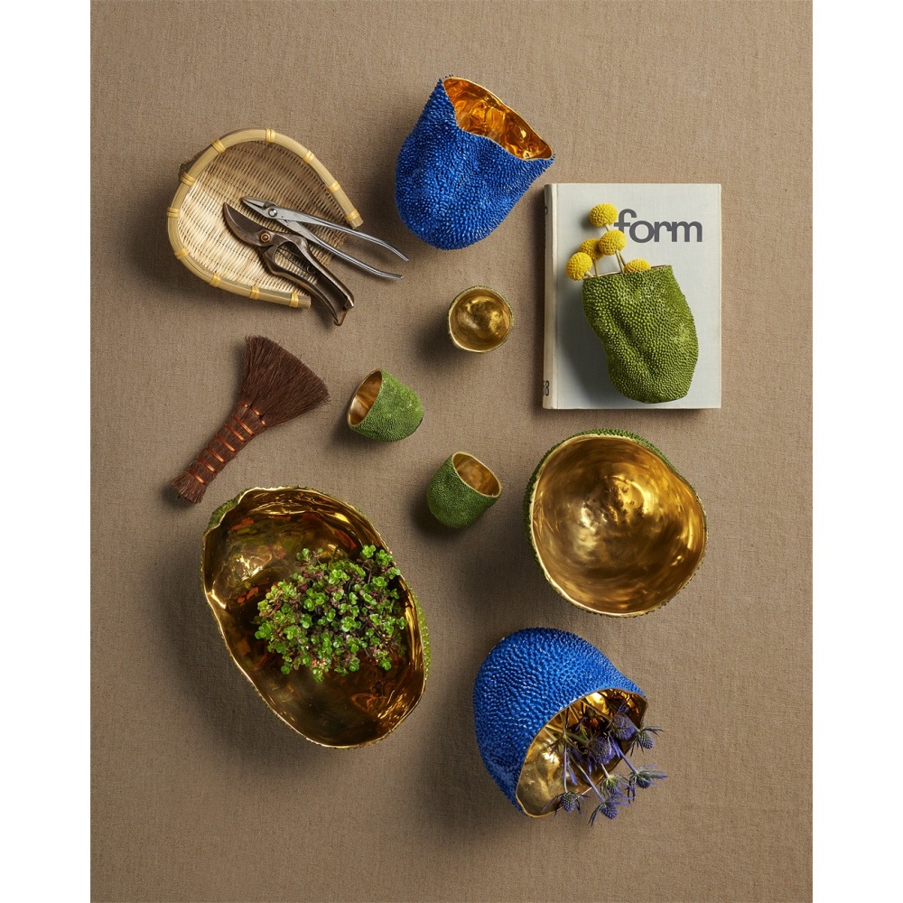 Our Jackfruit decorative vessels include the Jackfruit Small Green Vase that is made from a lost-wax process so it reads as if it is covered in the skin of the jackfruit. The inside of each bronze vase is a brilliant gold made of polished solid bronze, which will need to be cleaned from time to time to maintain its sheen. These green decorative vessels are watertight so they will not leak.
