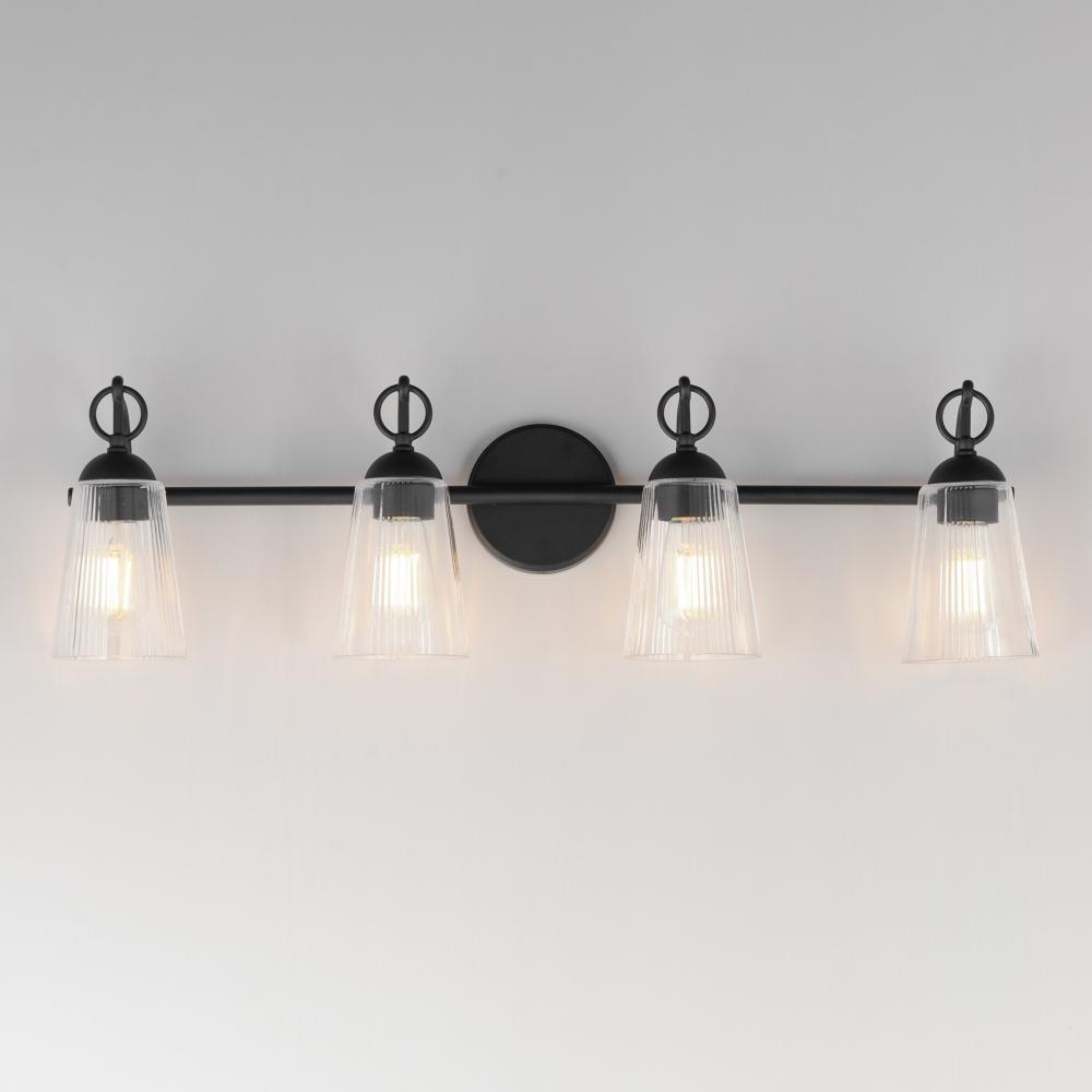 Inspired by the rugged charm of the American West, the Jackson Hole collection brings an elevated rustic sensibility to bath and vanity spaces. Tapered clear glass shades, subtly fluted with a vertical stripe detail, soften and refract light while reducing