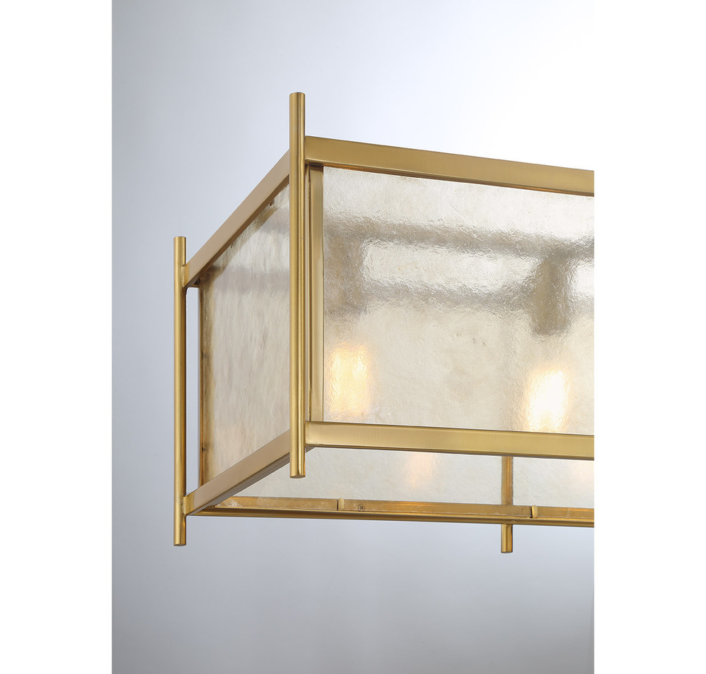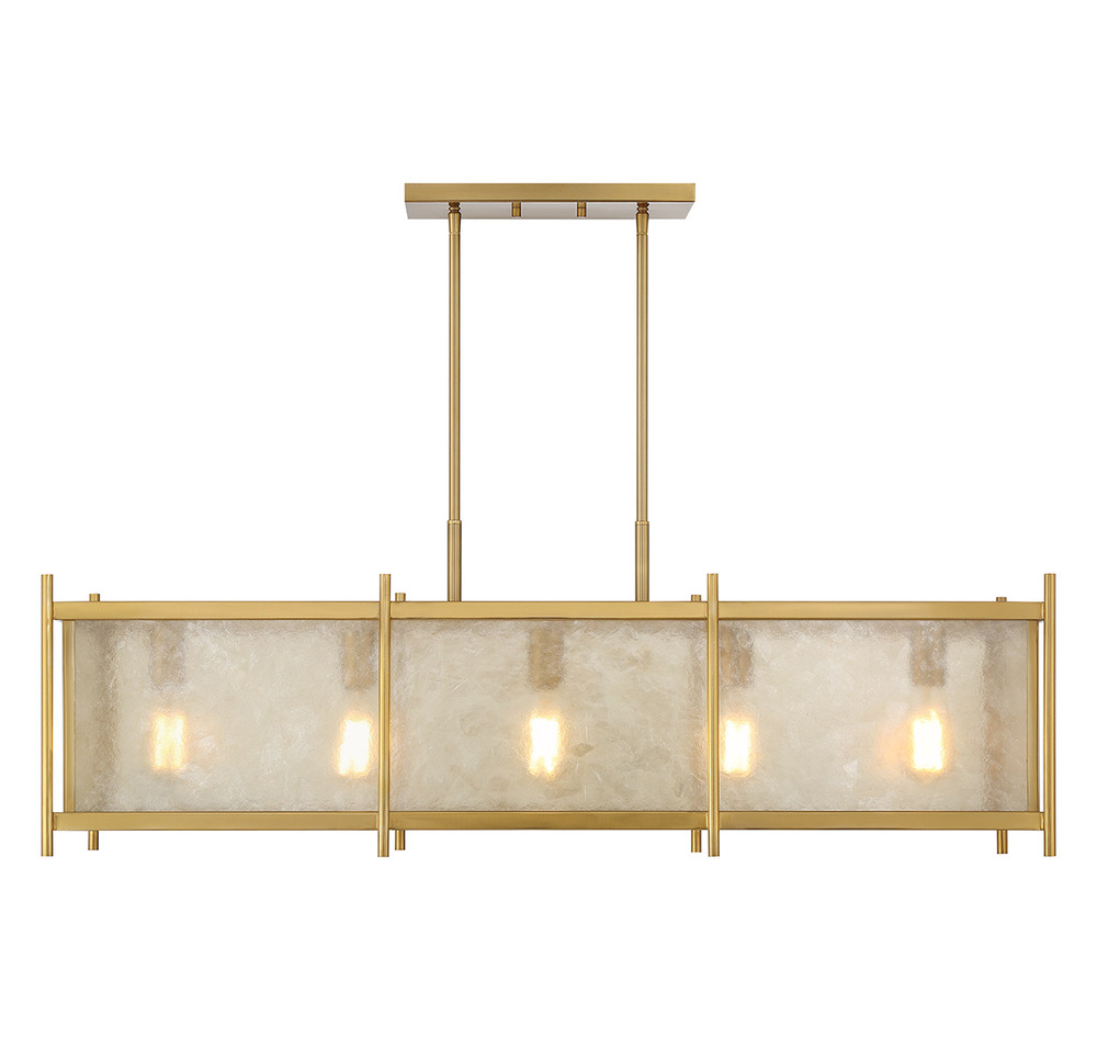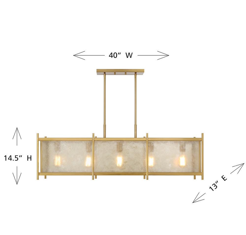 Create a warm and welcoming glow with the geometric chic Savoy House Jacobs 5-light linear chandelier. The clear mica glass shade pairs beautifully with the Warm Brass finish and imparts eye-catching texture. Jacobs is 40" in width, 13" in length and has an adjustable height ranging from 14.5" to 68.5". Comes with eight 12" downrods and two 6" downrods. Uses five standard size bulbs of up to 60 watts per bulb. Bulbs not included.