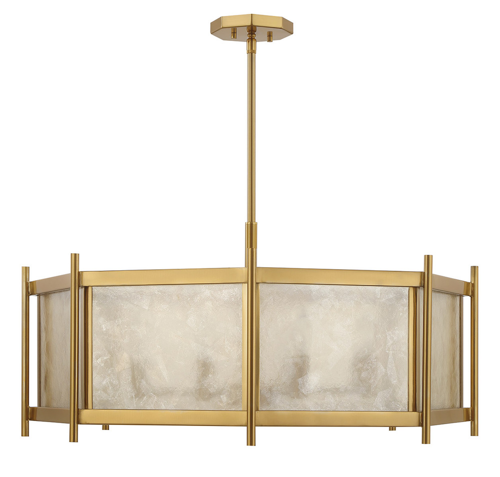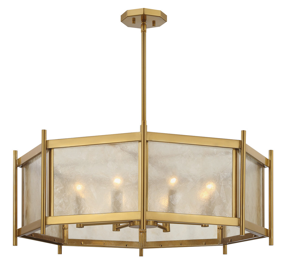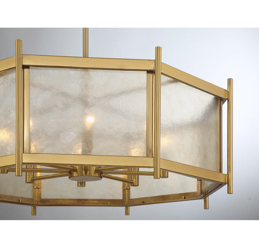 Create a warm and welcoming glow with the geometric chic Savoy House Jacobs 8-light chandelier. The clear mica glass shade pairs beautifully with the Warm Brass finish and imparts eye-catching texture. Jacobs is 32" in width and has an adjustable height ranging from 15.5" to 69.5". Comes with four 12" downrods and one 6" downrod. Uses eight candelabra size bulbs of up to 60 watts per bulb. Bulbs not included.