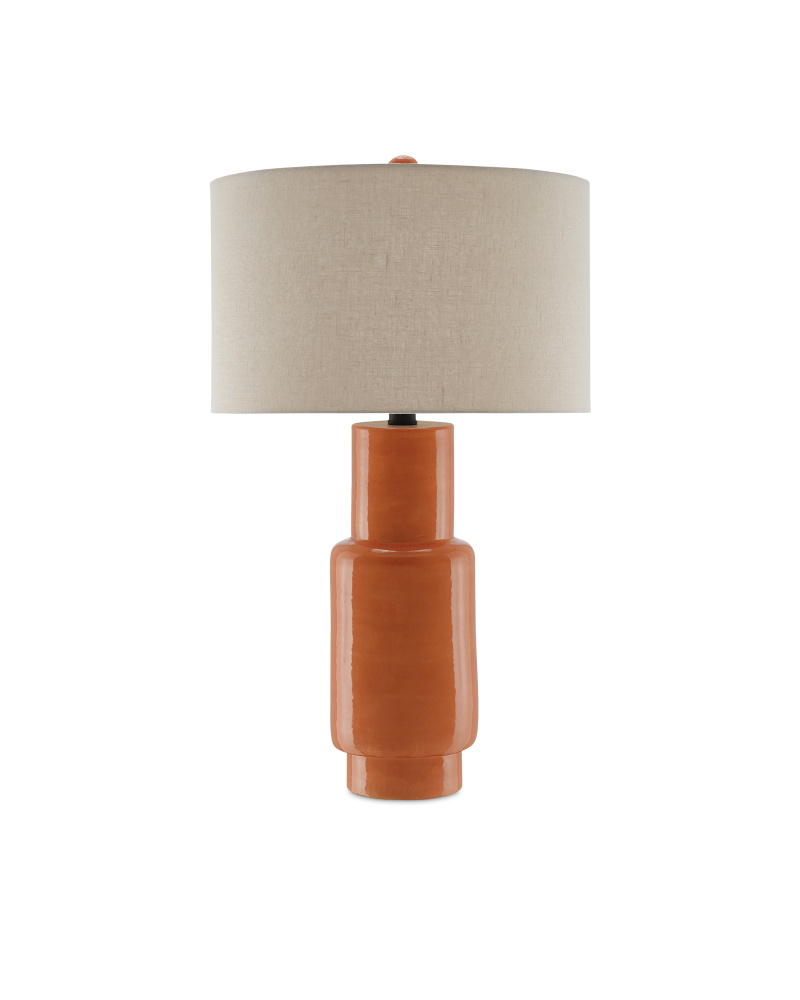 The Janeen Orange Table Lamp is a terracotta lamp in a vibrant orange. The metal hardware has a satin black finish, and the Janeen is topped with a flax linen drum shade that illuminates this orange lamp, a nod to kicky pottery of the past.