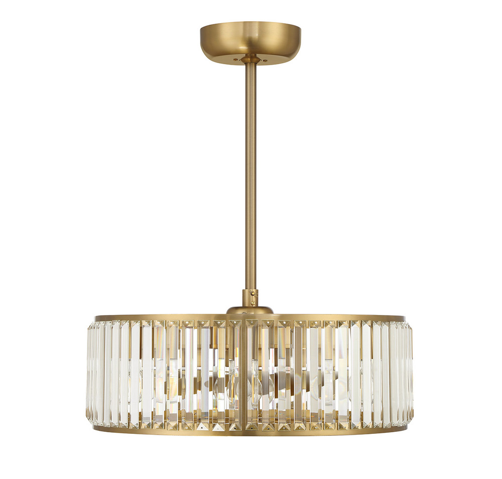 Lovers of glamorous style will adore this Savoy House Janus 6-light Fan D'Lier. The lights sparkle from behind slim, sleek pieces of faceted clear crystal that pop nicely against the Warm Brass finish. Janus uses an efficient DC motor, includes six standard size dimmable LED bulbs of 8 watts per bulb and has a handheld remote control for extra convenience. It is 23" in width and 10" in height. Comes with a 4" downrod and an 18" downrod. Fan D'Liers are a Savoy House exclusive that combines the best of ceiling fans with the best of chandeliers in one fabulously fashionable fixture. These custom designs are inspired by high-end designer styles and take top trends to a whole new level.
