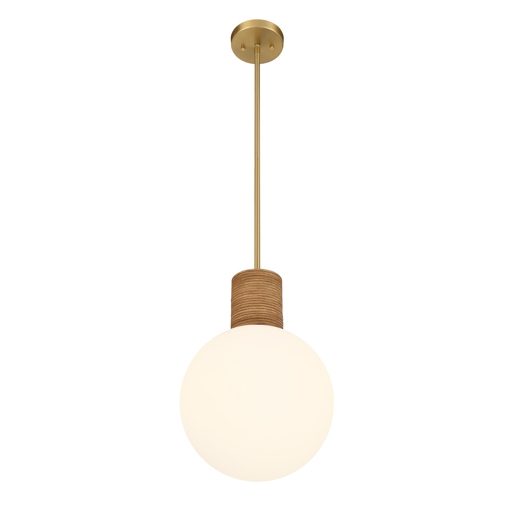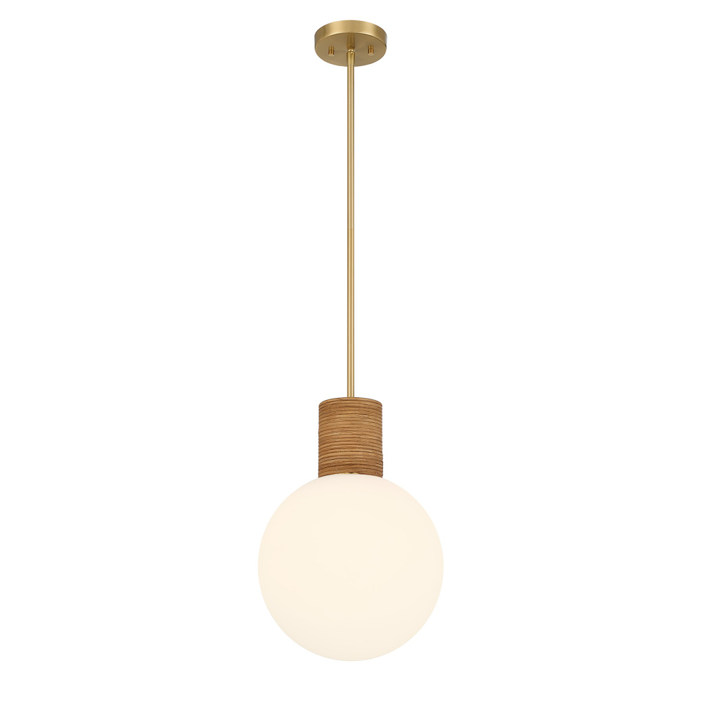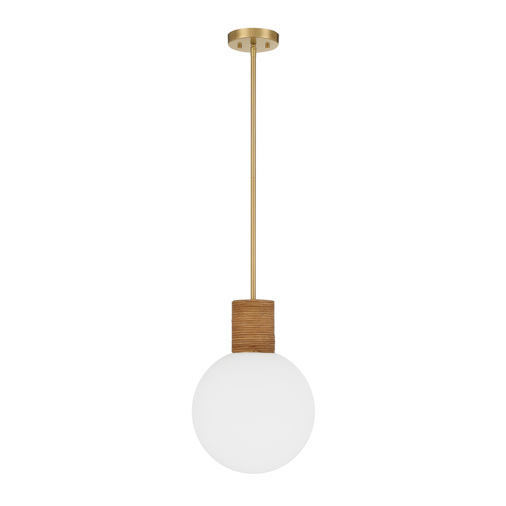 The Savoy House Jarrell 1-light pendant blends natural rattan, soft white opal glass and a glowing Warm Brass finish, bringing easygoing style to kitchens, hallways and more. Jarrell is 12" wide and height-adjustable from 16.5" to 70.5". It uses one standard size bulb of up to 60 watts (bulb not included) and includes four 12" downrods and one 6" downrod.