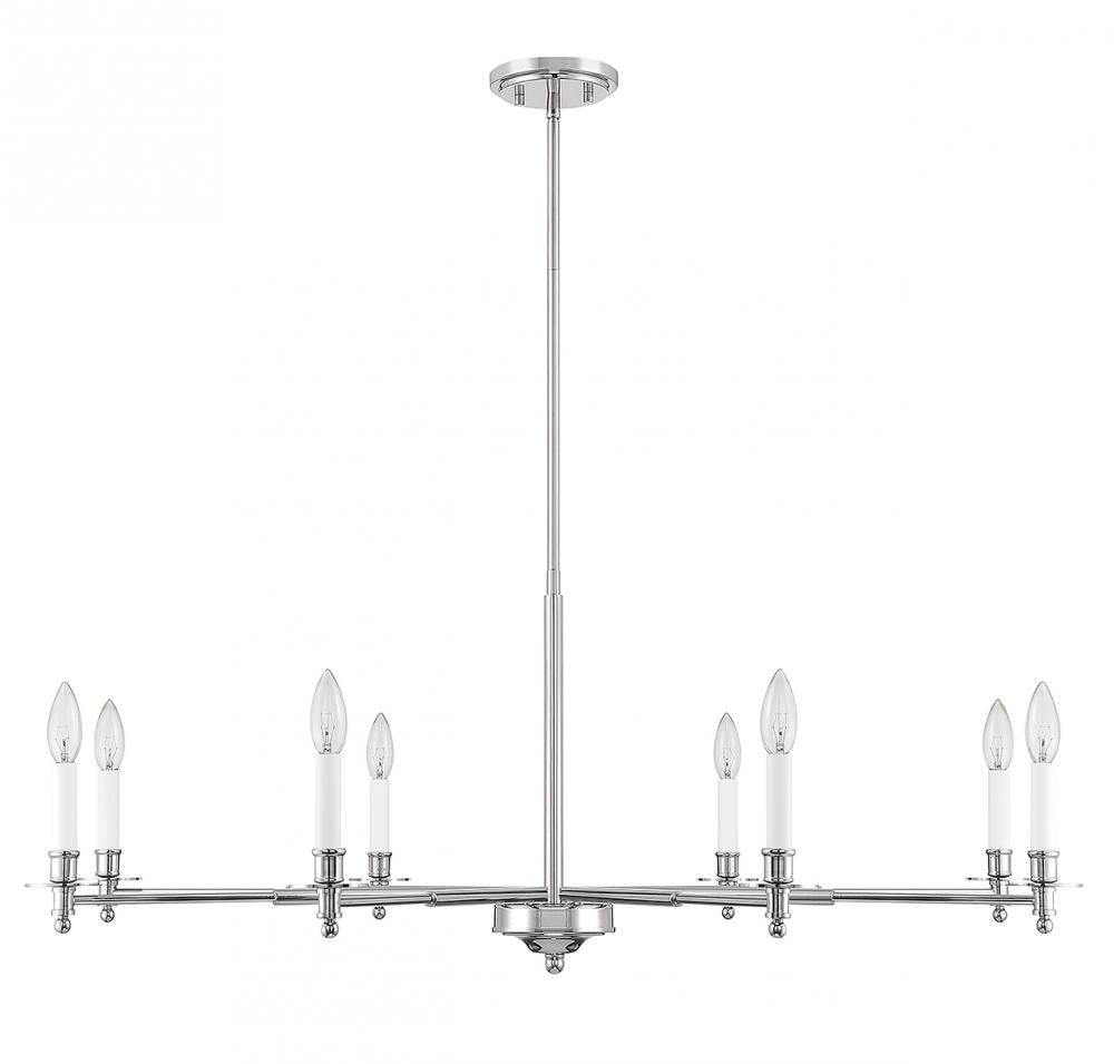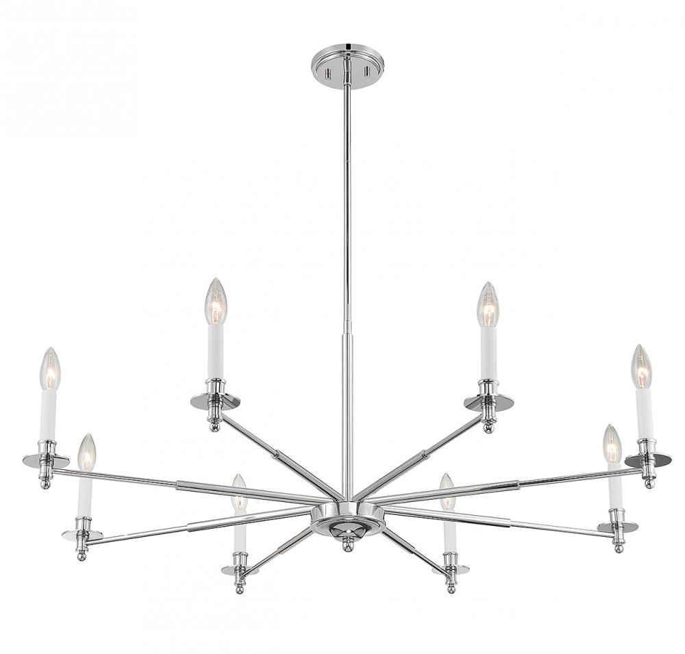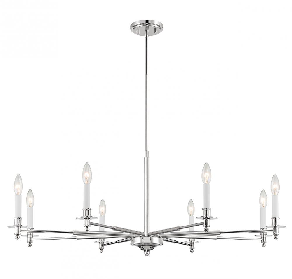 The Savoy House Jasmine 8-light chandelier has a traditional-inspired look that is perfectly versatile for a wide range of spaces and styles. Polished nickel finish with white candle covers. Jasmine is 42" in width and has an adjustable height ranging from 16" to 69.5". Comes with four 12" downrods and one 6" downrod. It uses 8 candelabra size bulbs of up to 60 watts per bulb (bulbs not included).