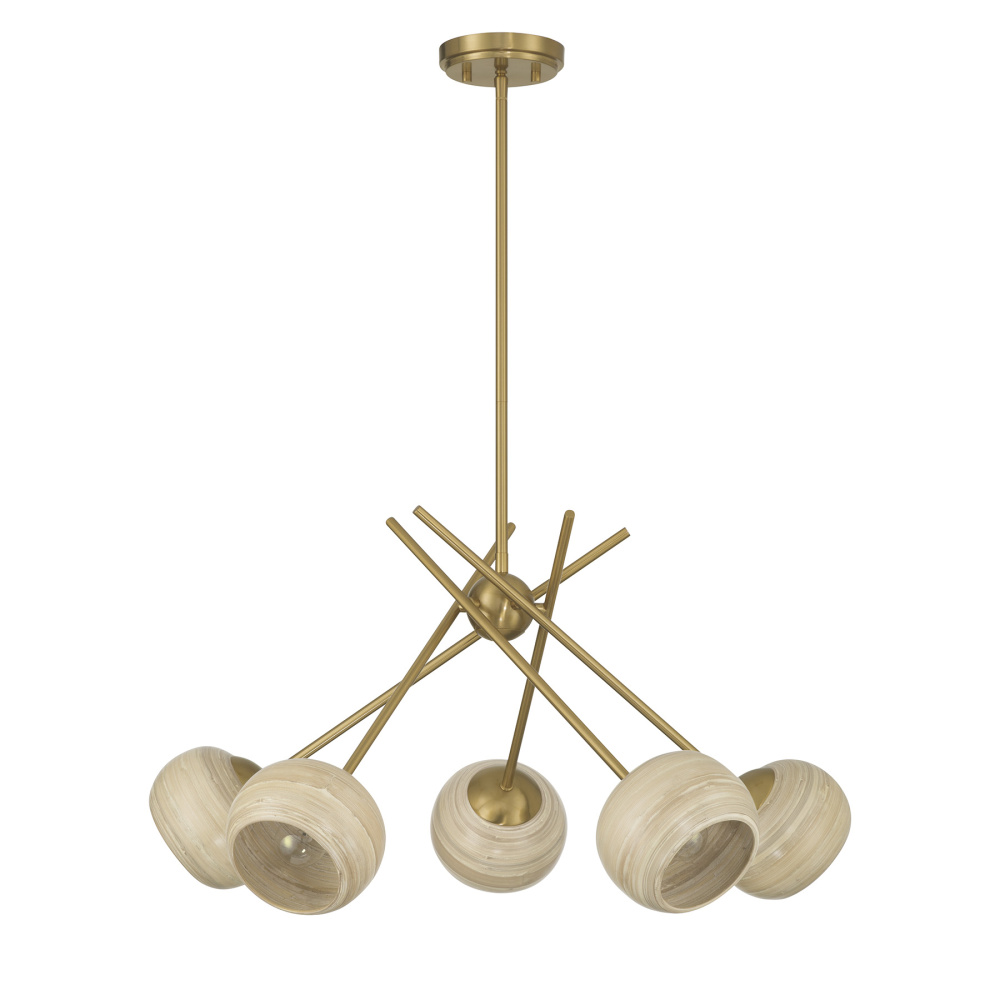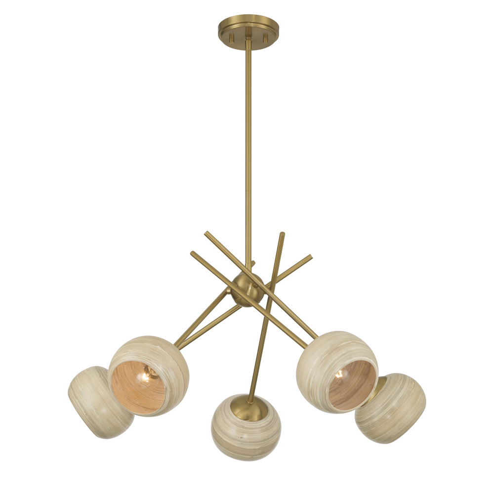 The Savoy House Jasper 5-light chandelier brings a lively mid-century spirit into your home with a touch of natural artistry. Each spun bamboo shade features hand-applied white striping that creates movement and visual rhythm, while the Warm Brass finish adds a radiant, welcoming glow. Jasper is 27.38" wide and has an adjustable height ranging from 20.86" to 68.86". It uses five candelabra size bulbs of up to 60 watts per bulb. Bulbs not included. Comes with four 12" downrods and one 6" downrod.