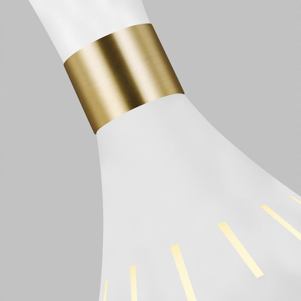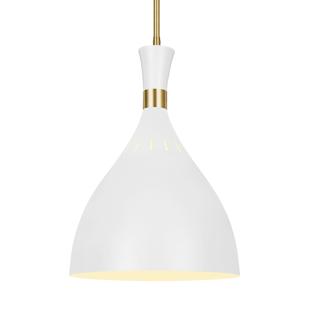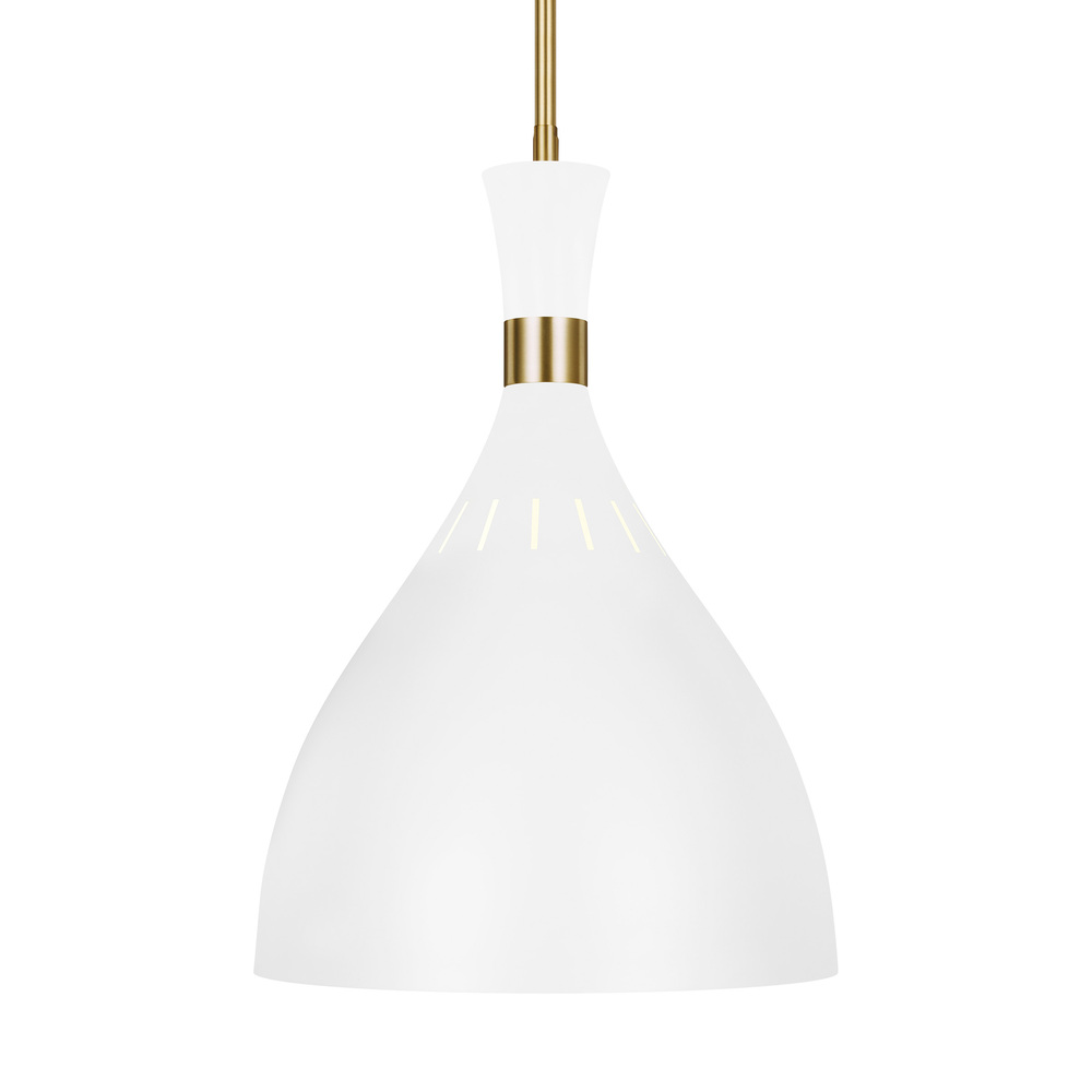 The Joan one light indoor pendant in matte white enhances the beauty of your home with ample light and style to match today's trends. Pairing a rich, two-tone finish with bold, geometric lines give Joan luxe appeal. Warm Burnished Brass joins with either Midnight Black or Matte White in a thoughtful juxtaposition of contrasting finishes on the 5-light chandeliers, the 1-light wall sconces and the 1-light table lamps. Each iconic, hourglass-inspired shade features small perforations towards its crown, allowing a soft glow to shine through, further articulating the distinctive details of this chic collection.