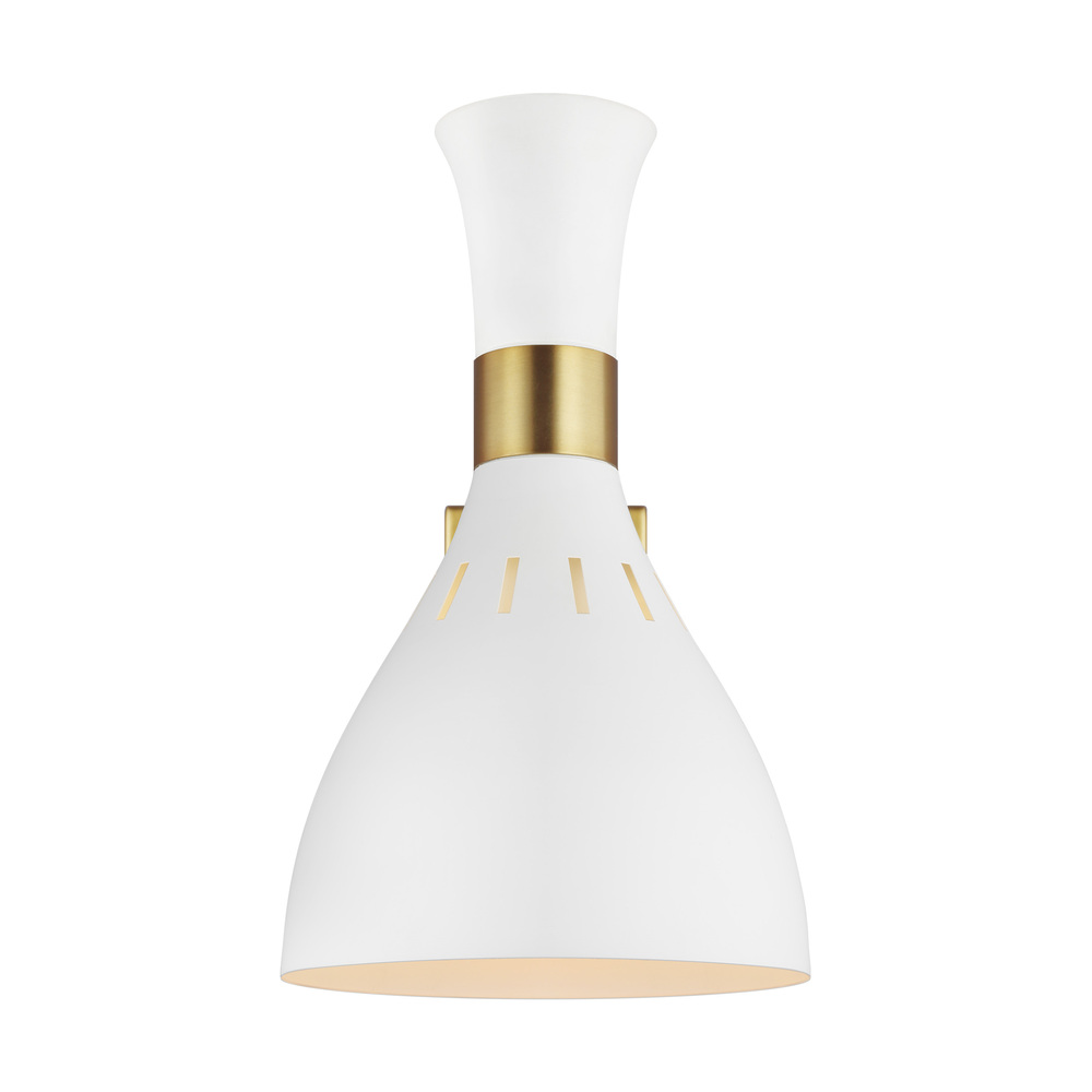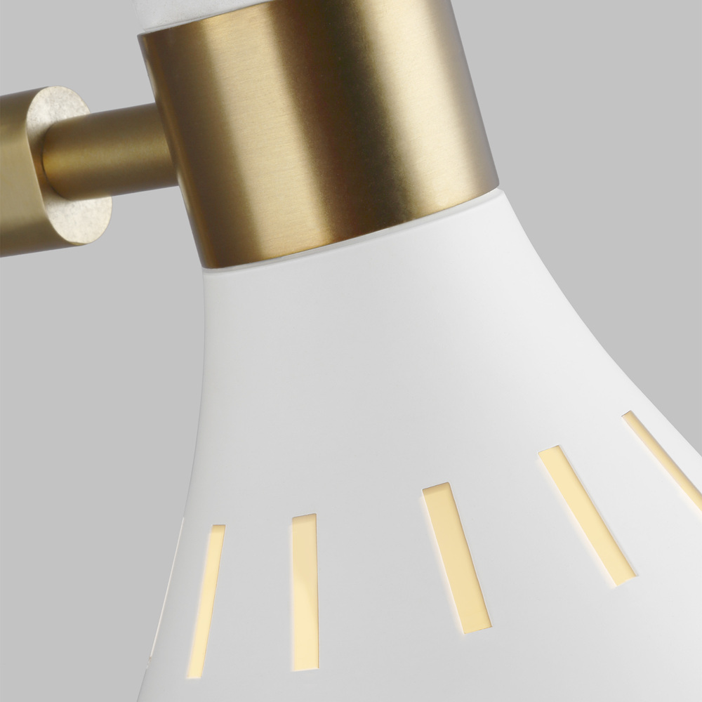 The Joan one light swing arm lamp in matte white offers task lighting in your powder room, bedroom or office. Joan's rich, two-tone finish with bold, geometric lines give it luxe appeal. Warm Burnished Brass joins with either Midnight Black or Matte White in a thoughtful juxtaposition of contrasting finishes. Each iconic, hourglass-inspired shade features small perforations towards its crown, allowing a soft glow to shine through, further articulating the distinctive details of this chic collection.