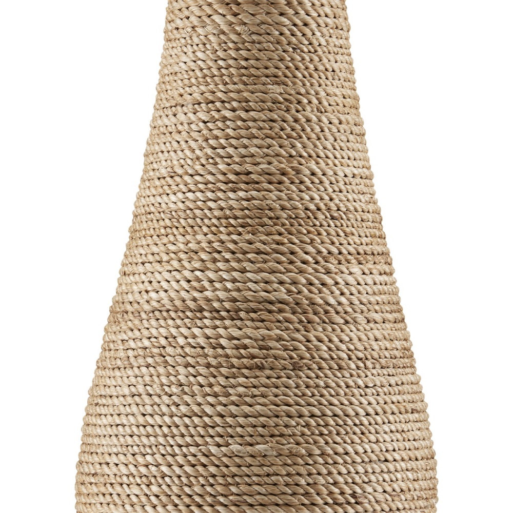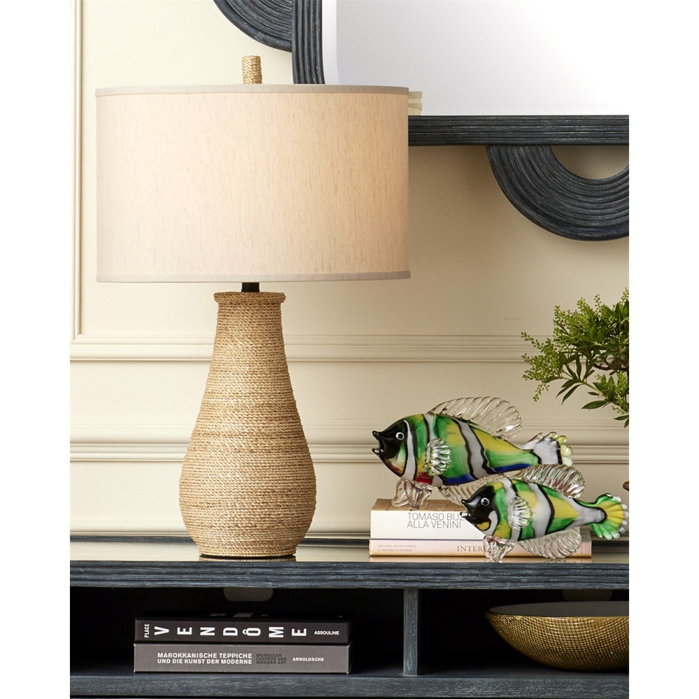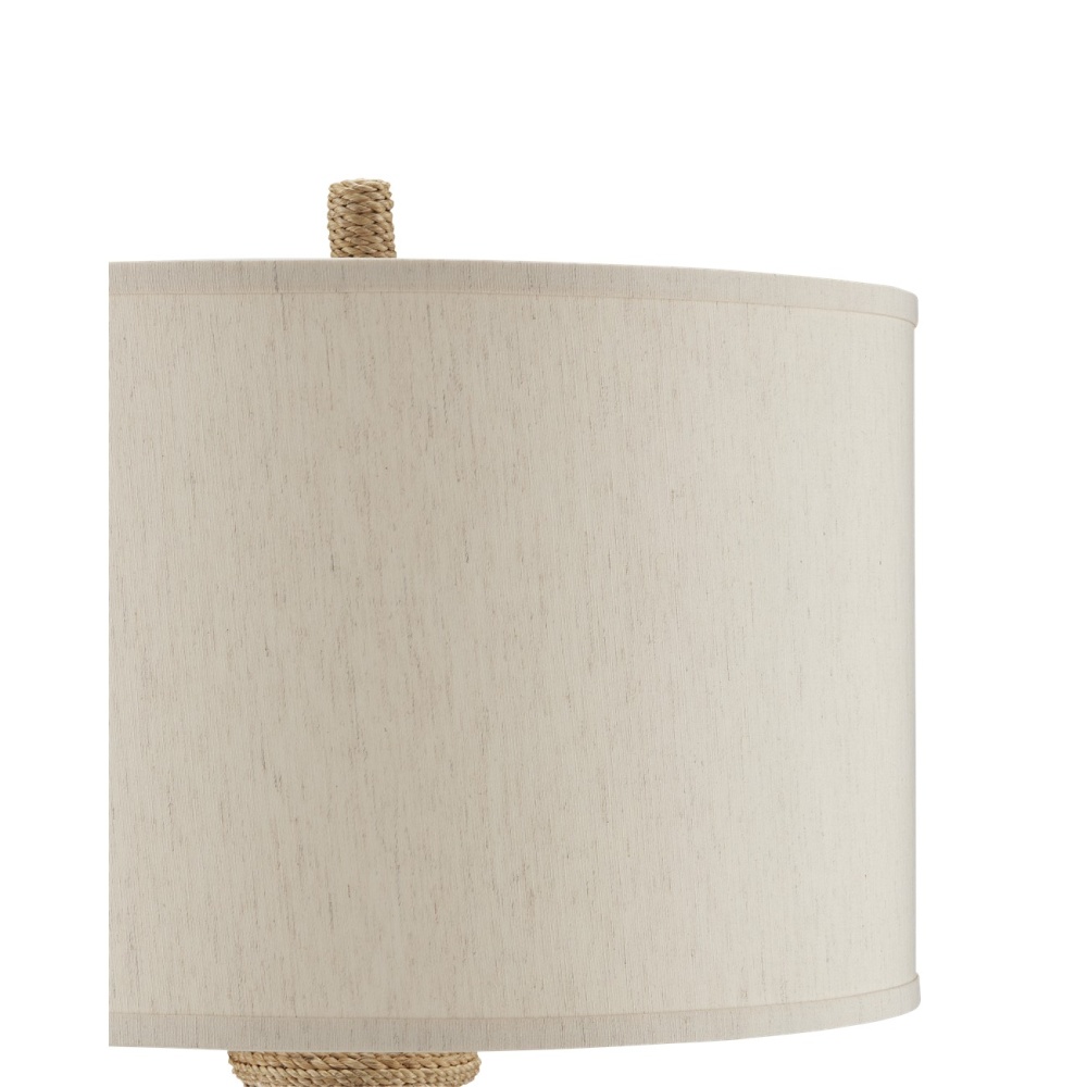 The Joppa Table Lamp has a tear-drop shaped body seamlessly wrapped in natural rope, a painstaking process that takes artisans many hours to achieve. A design detail that illustrates finesse is the narrow finial, also wrapped in rope, that fastens the light natural linen shade to the tan lamp. This is a sturdy rope lamp, as the material underneath that shapes it is terracotta.