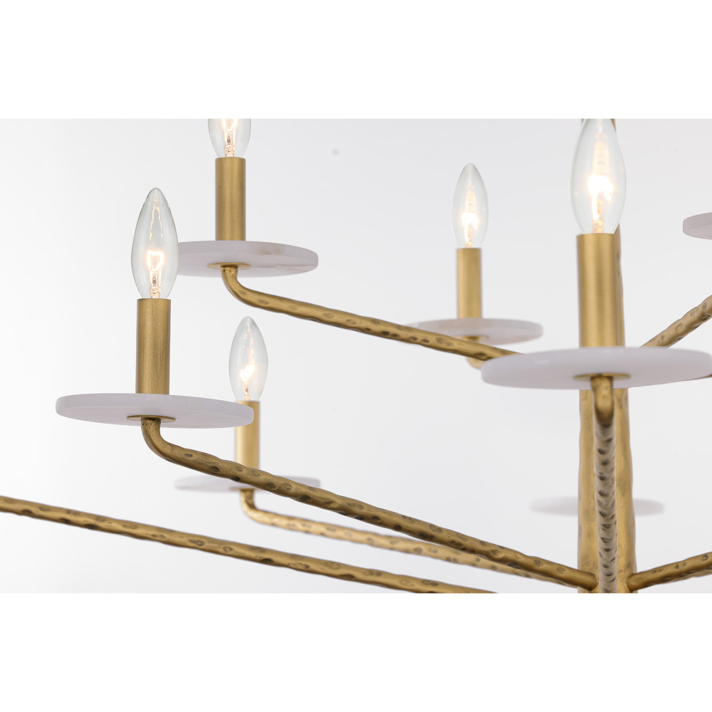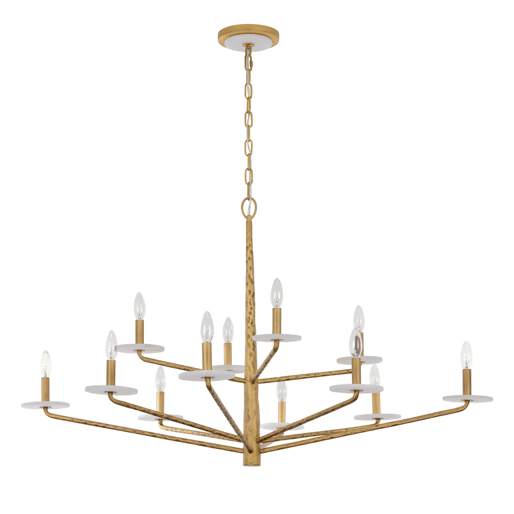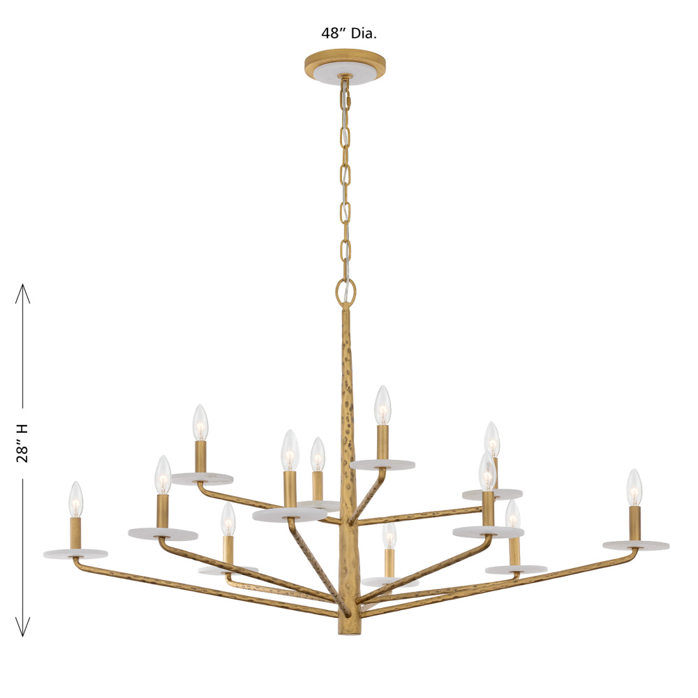 The Savoy House Judi 12-light chandelier was designed by award-winning interior designer and TV host Breegan Jane. Its organic structure showcases hammered metal that is finished in hand-painted Distressed Gold. Slim arms hold candle cups crafted from natural alabaster stone, bringing another dimension of nature-inspired style. There is also a disc of alabaster at the ceiling canopy, too! Judi is 28" in height and 48" in width. It uses twelve candelabra size bulbs of up to 60 watts per bulb. Bulbs not included. Comes with 120" of chain.