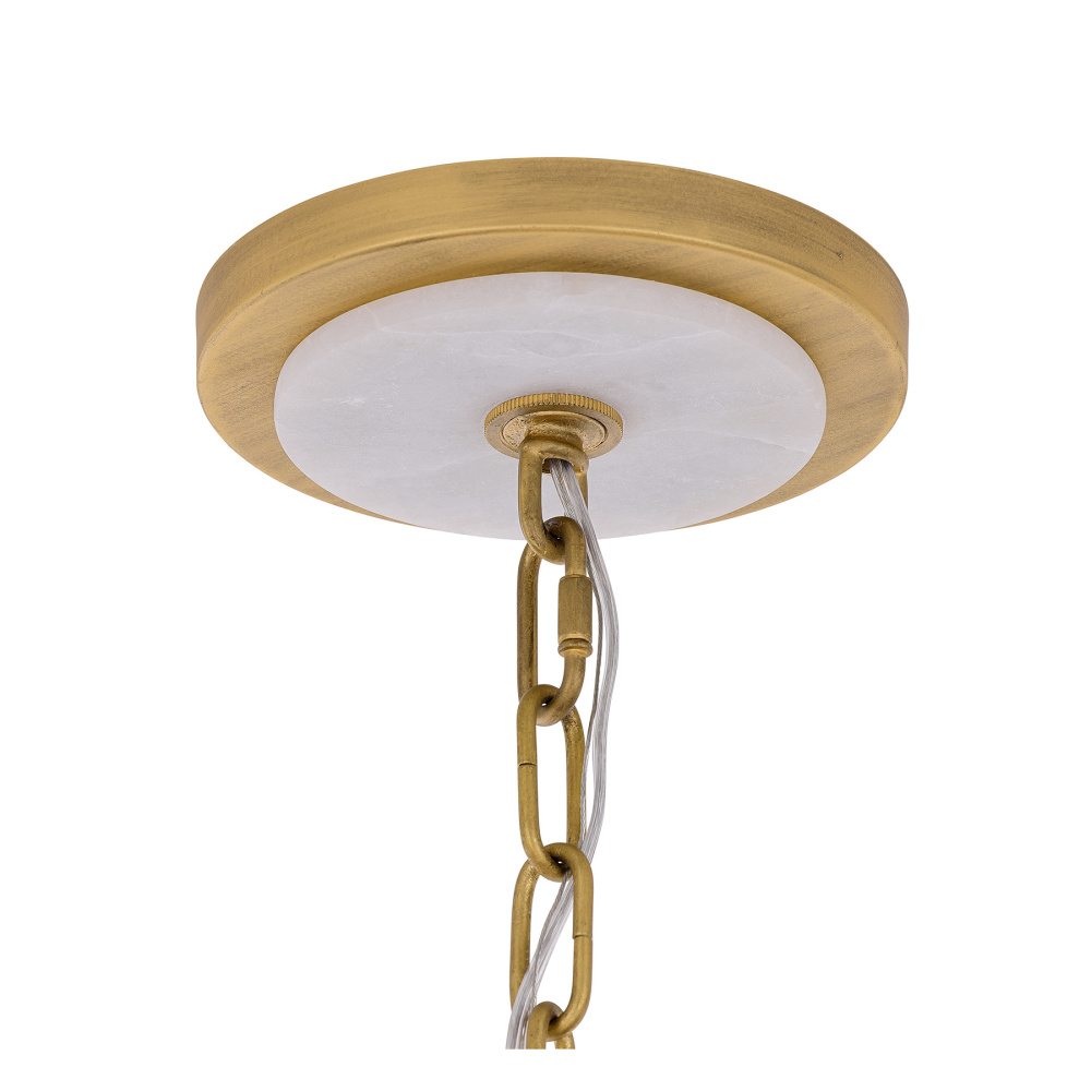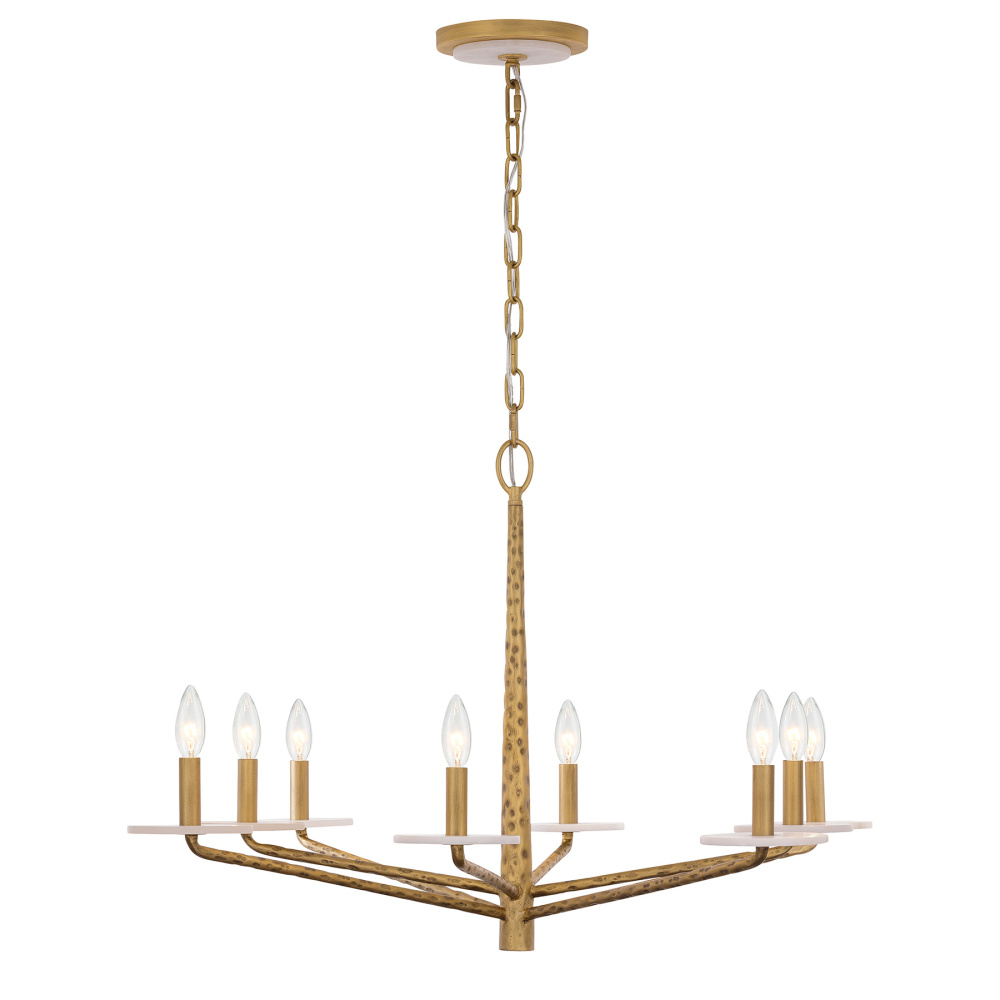 The Savoy House Judi 8-light chandelier was designed by award-winning interior designer and TV host Breegan Jane. Its organic structure showcases hammered metal that is finished in hand-painted Distressed Gold. Slim arms hold candle cups crafted from natural alabaster stone, bringing another dimension of nature-inspired style. There is also a disc of alabaster at the ceiling canopy, too! Judi is 22" in height and 38" in width. It uses eight candelabra size bulbs of up to 60 watts per bulb. Bulbs not included. Comes with 120" of chain.