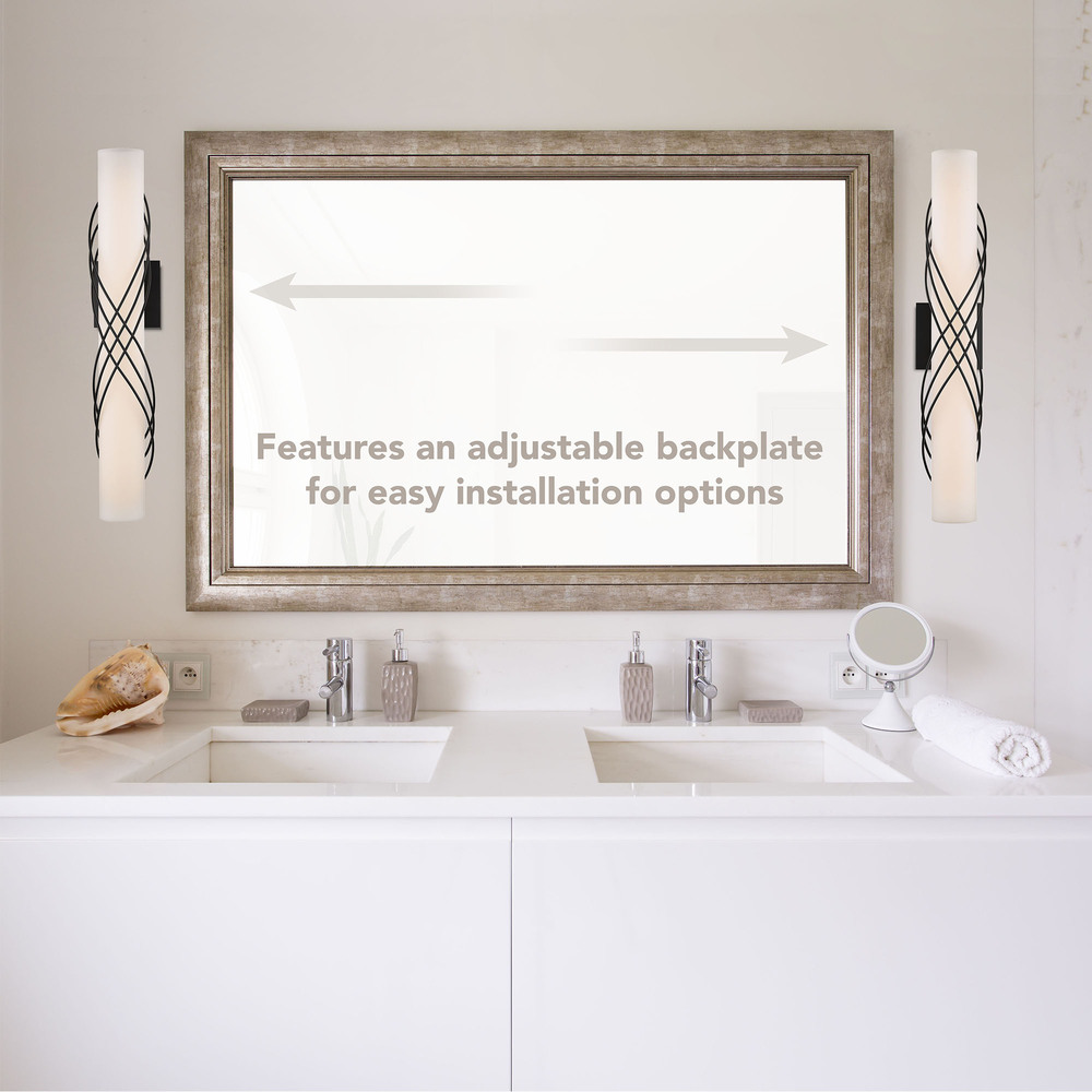 Clean, modern and sophisticated, Juliette is a series of dimmable, energy-efficient LED bath bars. Metal ribbons wrap the fixtures for a feminine look. Available in choice modern finish options. Fixtures feature an adjustable back plate that allows horizontal and vertical install. Remove the cover plate for a sleeker install. The bright lights are perfect over or next to a mirror.