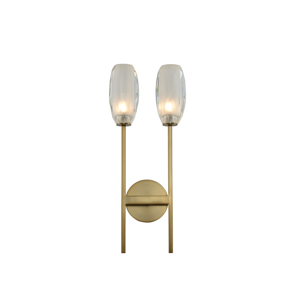 June features a linear modern design with skinny faceted glass featuring a frosted interior and a trendy Winter Brass finish. G9 LED lamps included.