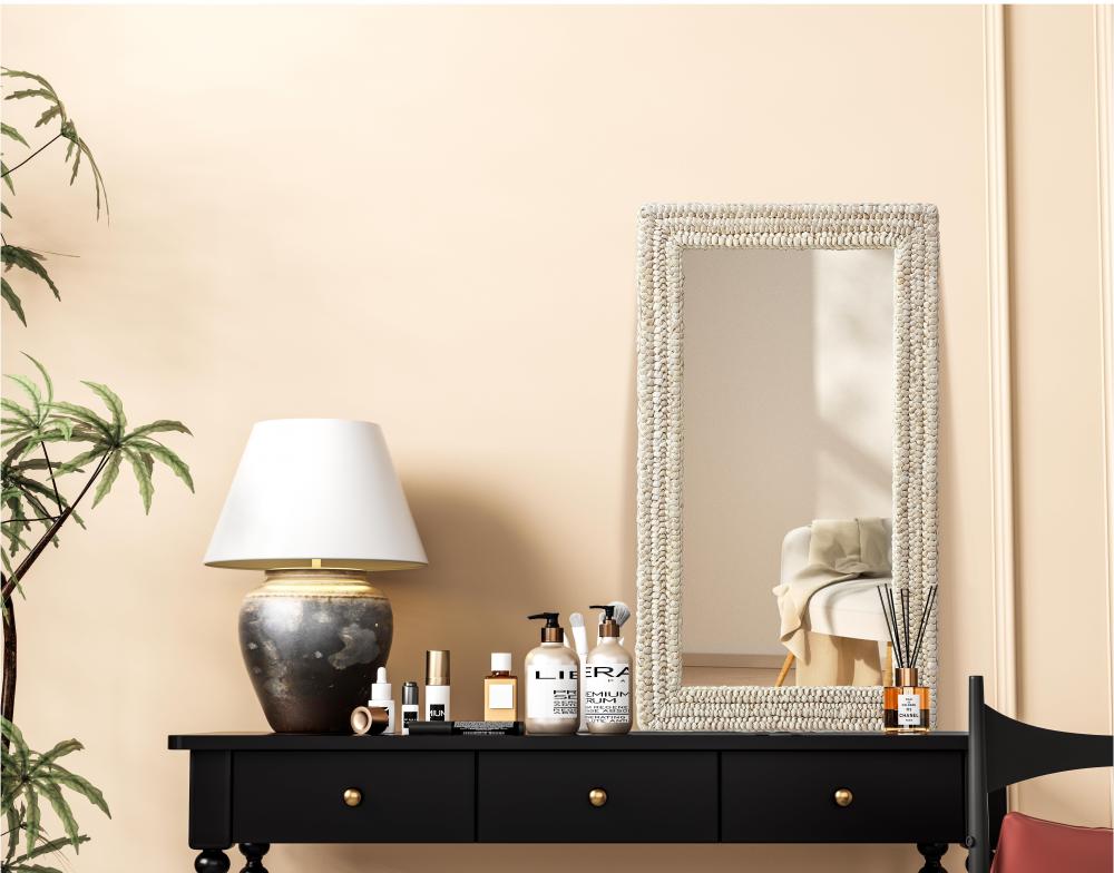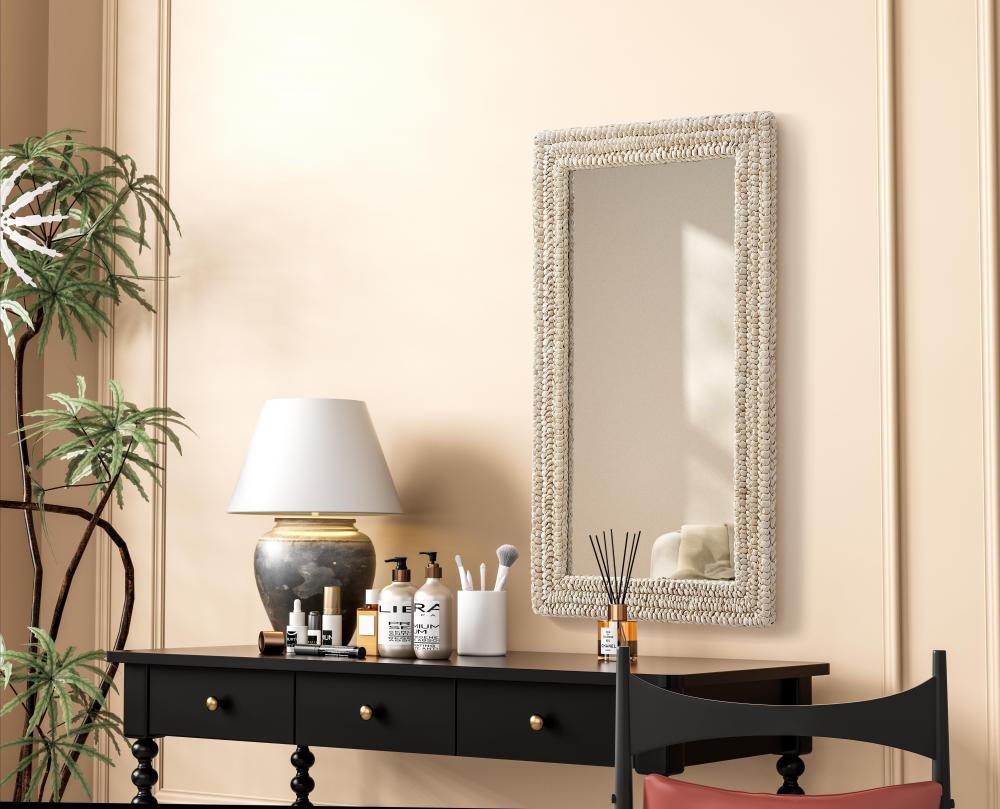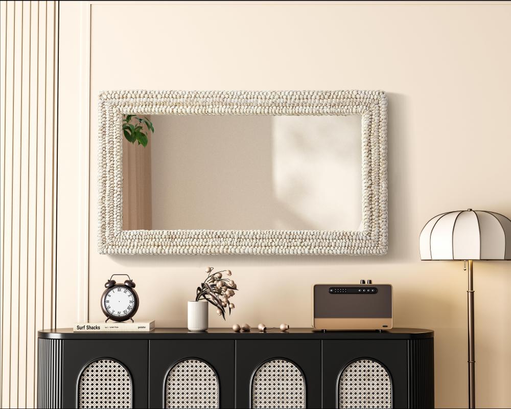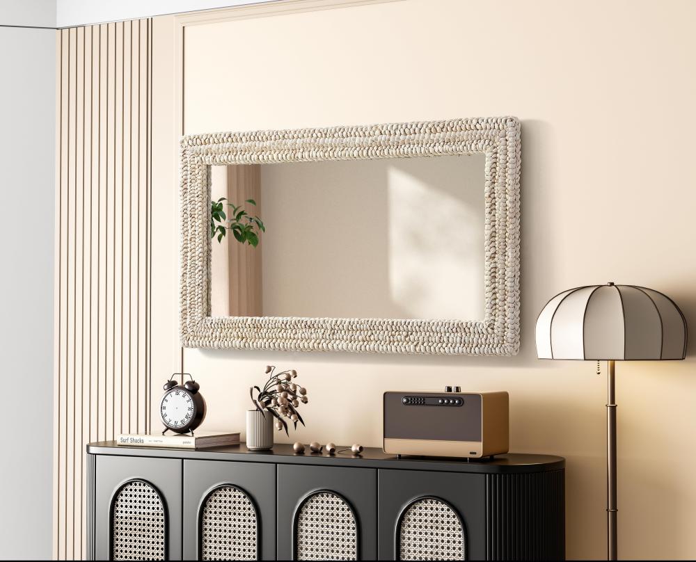 Transform your space with this stunning wall mirror that blends natural charm with functional design. Crafted from MDF, cornhusk, and high-quality mirror, the textured woven frame brings warmth and character to your decor. Whether you're decorating a hallway, living room, or bedroom, this mirror comes in a variety of shapes—including rectangle, round, oval, and arch—along with multiple size options to perfectly suit your needs. Designed for versatility, the mirror features four inset metal hangers, allowing you to mount it either vertically or horizontally with ease. Its reflective surface not only adds a touch of brightness but also creates the illusion of a larger room, enhancing your space. with durable materials and ready-to-hang hardware, this mirror is as practical as it is stylish, making it a must-have piece for any home.
