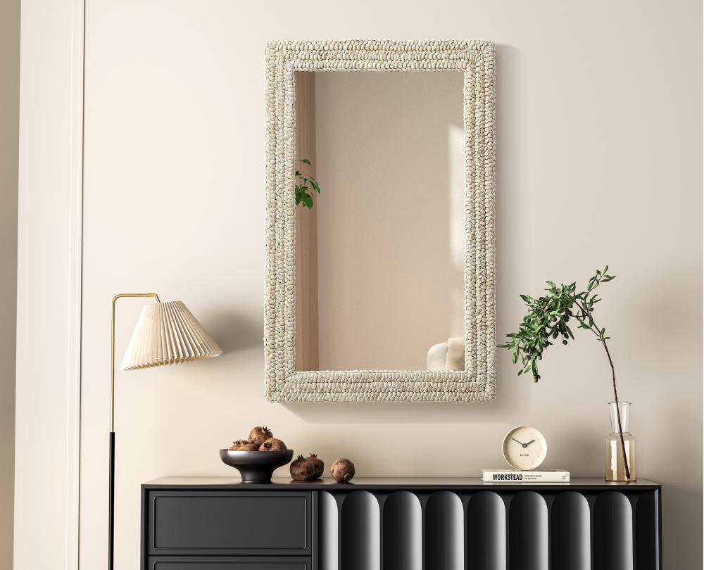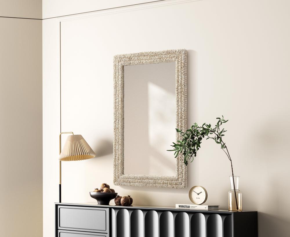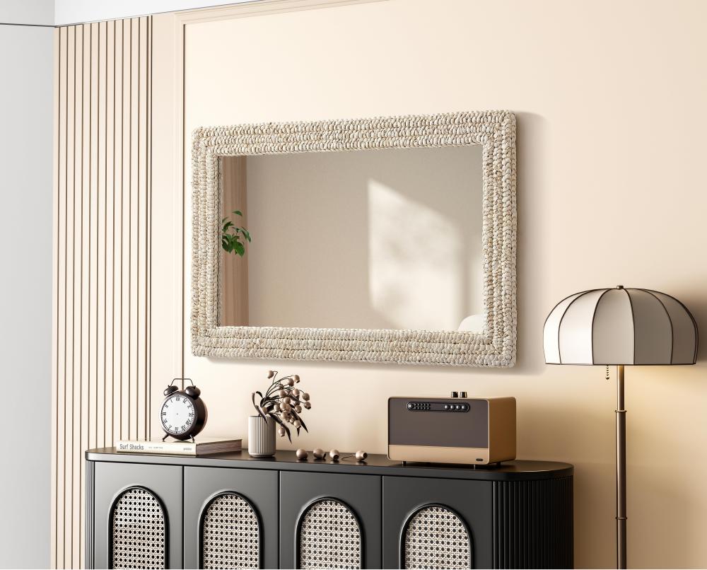 Transform your space with this stunning wall mirror that blends natural charm with functional design. Crafted from MDF, cornhusk, and high-quality mirror, the textured woven frame brings warmth and character to your decor. Whether you're decorating a hallway, living room, or bedroom, this mirror comes in a variety of shapes—including rectangle, round, oval, and arch—along with multiple size options to perfectly suit your needs. Designed for versatility, the mirror features four inset metal hangers, allowing you to mount it either vertically or horizontally with ease. Its reflective surface not only adds a touch of brightness but also creates the illusion of a larger room, enhancing your space. with durable materials and ready-to-hang hardware, this mirror is as practical as it is stylish, making it a must-have piece for any home.