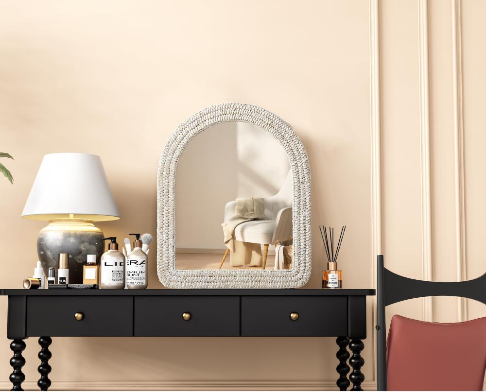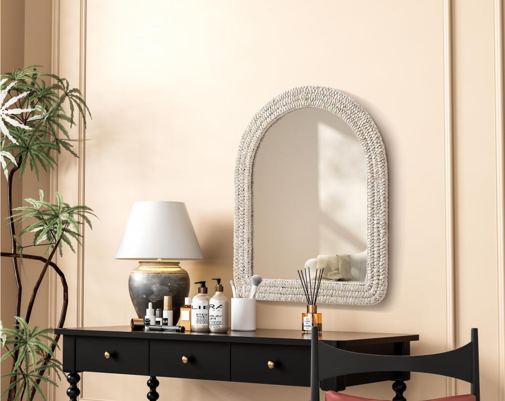 Transform your space with this stunning wall mirror that blends natural charm with functional design. Crafted from MDF, cornhusk, and high-quality mirror, the textured woven frame brings warmth and character to your decor. Whether you're decorating a hallway, living room, or bedroom, this mirror comes in a variety of shapes—including rectangle, round, oval, and arch—along with multiple size options to perfectly suit your needs. Designed for versatility, the mirror features two inset metal hangers, allowing you to mount it vertically with ease. Its reflective surface not only adds a touch of brightness but also creates the illusion of a larger room, enhancing your space. with durable materials and ready-to-hang hardware, this mirror is as practical as it is stylish, making it a must-have piece for any home.