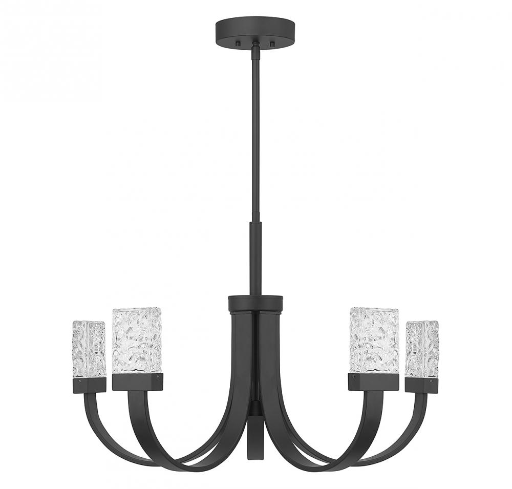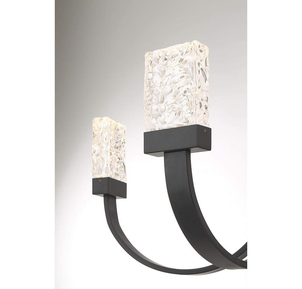 The Savoy House Kahn 6-light chandelier brings a uniquely contemporary take on the classic chandelier silhouette with wide, flat curving arms that are each topped with a cube of gorgeously textured water glass. The glass is illuminated by integrated LED, so there's no bulb to interrupt the look. A small downlight placed between the arms adds another thoughtful touch. Finished in black. Kahn is 30" in width and has an adjustable height ranging from 20.5" to 74". Comes with four 12" downrods and one 6" downrod.