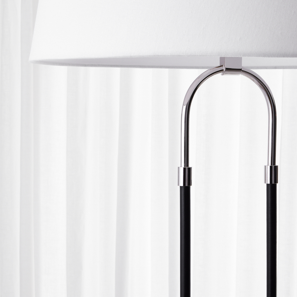 In the Katie one light floor lamp leather straps contrast with metal and white linen fabric shade to round out a timeless design. Available in: Time Worn Brass with Brown Leather or Polished Nickel with Black Leather. The combination of leather and steel gives this round chandelier equestrian flair.